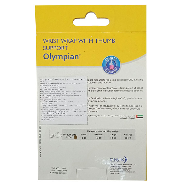 Đai cổ tay và ngón tay | Đai cổ tay và ngón tay cái Olympian.   Đặc điểm nổi bật:   -Hàng nhập khẩu cao cấp chính hãng theo tiêu chuẩn Châu Âu. -Chất liệu thun co giãn, đàn hồi tốt giúp người dùng cảm thấy thoải mái và dễ chịu khi sử dụng -Hỗ trợ hiệu quả cho khớp xương cổ tay và ngón tay cái. -hỗ trợ Điều trị, ngăn ngừa chấn thương thể thao.         Đặc điểm của sản phẩm:   -Cung cấp sự hỗ trợ hiệu quả và chắc chắn cho khớp xương cổ tay và ngón cái cấu tạo rất chắc chắn, độ bền cao, rất linh hoạt, rất dễ sử dụng và rất thích hợp sử dụng trong thể thao như cầu lông, tennis, thể hình... -Tên của sản phẩm đã nêu lên công dụng chính của nó đó là giúp chống và hỗ trợ điều trị bong gân do tập luyện với cường độ cao. -Băng hỗ trợ quấn cổ tay và ngón cái hiệu OLYMPIAN còn hỗ trợ điều trị đau do viêm khớp, căng khớp và khó cử động cổ tay.         Chỉ định sử dụng sản phẩm:   -Đau cổ tay khi bị viêm khớp, căng khớp, bong gân và trong trường khó cử động cổ tay. -hỗ trợ Điều trị chấn thương thể thao, chấn thương do tai nạn và bảo hộ lao động tại nơi làm việc. ngăn ngừa chấn thương cổ tay xảy ra hoặc giúp hỗ trợ cổ tay sau một chấn thương giúp chống và hỗ trợ điều trị bong gân do tập luyện với cường độ cao.     Sản xuất và nhập khẩu:   -Sản phẩm đạt tiêu chuẩn CHÂU ÂU do hãng DYNAMIC của Ấn Độ sản xuất xuất khẩu trên 35 nước trên thế giới bao gồm Anh, Mỹ, EU, châu Á..   Size sản phẩm:  Đo chu vi cổ tay (cm)   Size Đo chu vi cổ tay (cm) S 14-16 cm M 16-18 cm L 18-20 cm XL 20-22 cm   Hướng dẫn sử dụng:   Chọn size phù hợp ( đo chu vi cổ tay) Đeo sản phẩm vào ngón tay theo hình. Sau đó quấn băng dán vòng qua cổ tay và cố định bằng dây buộc dán.