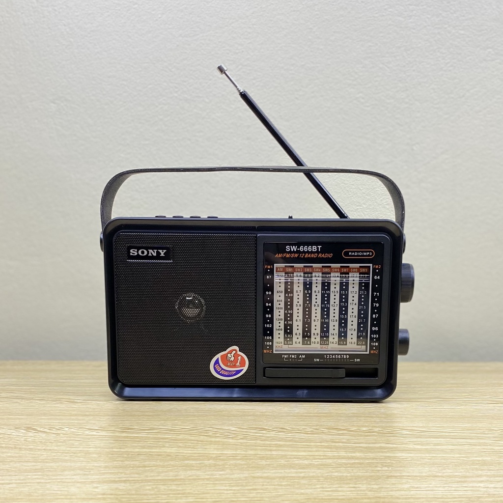 Đài Radio Đa Năng Shuae SW-666BT 12Band Fm/Am/Sw, Bluetooth/Usb/Thẻ Nhớ, Đài Nghe Nhạc Cao Cấp, Tặng Pin Sạc- Đài radio đa năng Shuae SW-666BT 12Band, món quà cho những người lớn tuổi mê theo dõi những chương trình trên sóng radio. Đây là thiết bị nghe radio cao cấp từ hãng Shuae, bắt sóng rất nhạy, âm thanh nghe lớn và rõ ràng, ngoài ra máy còn hỗ trợ thêm tính năng nghe nhạc MP3 qua bluetooth, thẻ nhớ và USB Đặc biệt đài radio Shuae SW-666BT có đèn pin rất sáng và pin sạc rất thuận tiện cho người già. GIỚI THIỆU VỀ ĐÀI RADIO BLUETOOTH SHUAE SW-666BT: - Đài radio cho người già SHUAE SW-666BT không đơn thuần chỉ là một máy nghe radio/nghe nhạc thông thường, mà còn là một người bạn, người đồng hành cùng với người cao tuổi. Người già ở thành phố rất cần những người bạn tâm sự, khi mà mỗi người đều có công việc riêng, không gian sống đang dần bị thu hẹp lại hoặc đêm về chằn chọc khó ngủ thì lúc đó chiếc đài mini Shuae SW-666BT sẽ là người bạn tâm lý nhất. - Đài radio đa năng Shuae SW-666BT đa năng bắt radio khoẻ với 12 bands FM 1-2, AM, SW1-9. Ngoài ra, Đài nghe nhạc SHUAE 666BT còn là chiếc máy nghe nhạc Mp3 rất hay kết nối đa năng qua bluetooth, USB, Thẻ nhớ. Đài nghe nhạc radio Shuae SW-666BT còn tích hợp đèn led siêu sáng ở mặt cạnh và được H2pro tặng kèm pin sạc 18650, giúp sản phẩm trở nên tiện dụng hơn với người lớn tuổi. THÔNG SỐ KĨ THUẬT VỀ ĐÀI RADIO BLUETOOTH SHUAE SW-666BT: - Thương hiệu : SHUAE. - Model : SW-666BT. - Chất liệu : nhựa ABS. - Công suất : 3W. - Kết nối bluetooth. - Nghe nhạc MP3/WMA từ : USB/SD/MMC card. - Radio 12 bands FM 1-2/AM/SW1-9, dải tần: + AM: 530 - 1600KHz. + FM: 64 - 108MHz. + SW1-6: 6.8 - 18.0MHz. - Đèn pin led - Dung lượng pin : 1200mAh ( pin 18650 ) - Nguồn : AC 220V/ 50Hz. - Điện áp sạc : DC 3V (UM - 1x2pcs). - DC in: 5V 500mA - Kích thước sản phẩm ( D x R x C ) : 21.5 x 7.5 x 13 ( cm ) - Cân nặng đóng hộp: 0.8 ( kg ) - Bộ sản phẩm bao gồm: 1x Đài SHUAE SW-666BT, 1x Dây nguồn, 1x Pin Sạc 18650