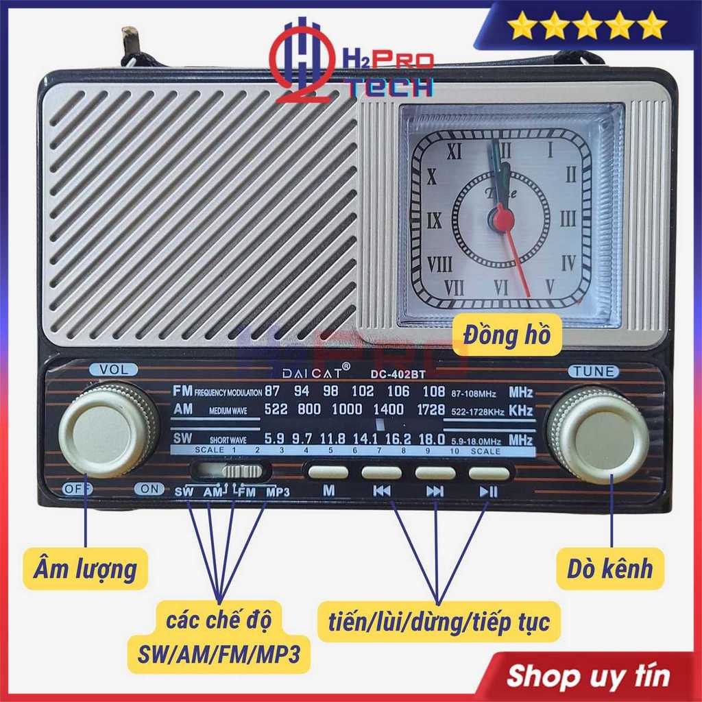 Chức năng : Thu đài FM/AM/SW, Phát nhạc thẻ nhớ, Đèn pin, Đồng Hồ