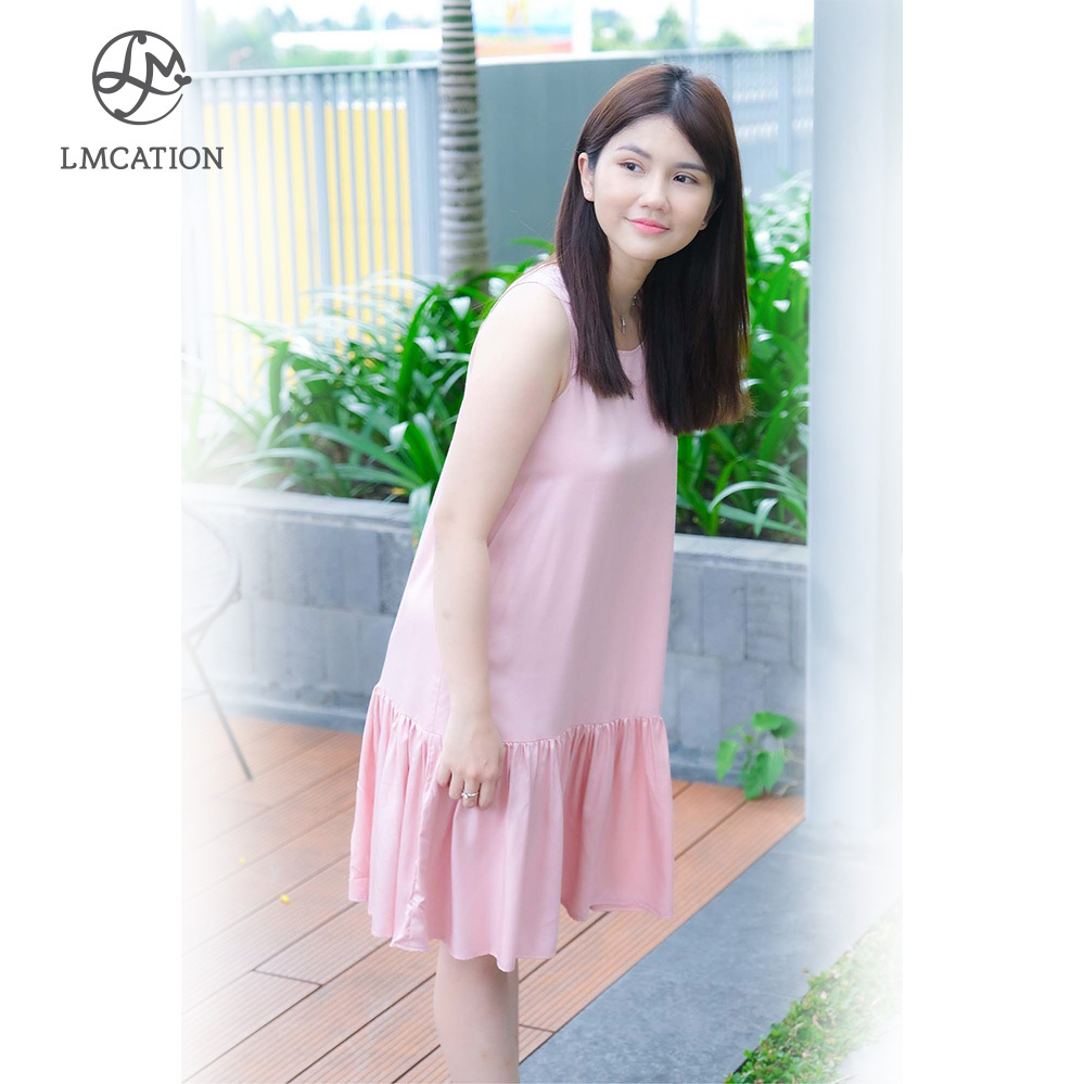Chiếc đầm LMcation Tencel Mia được thiết kế sát nách, có cổ tròn và viền bèo dài đến đầu gối.