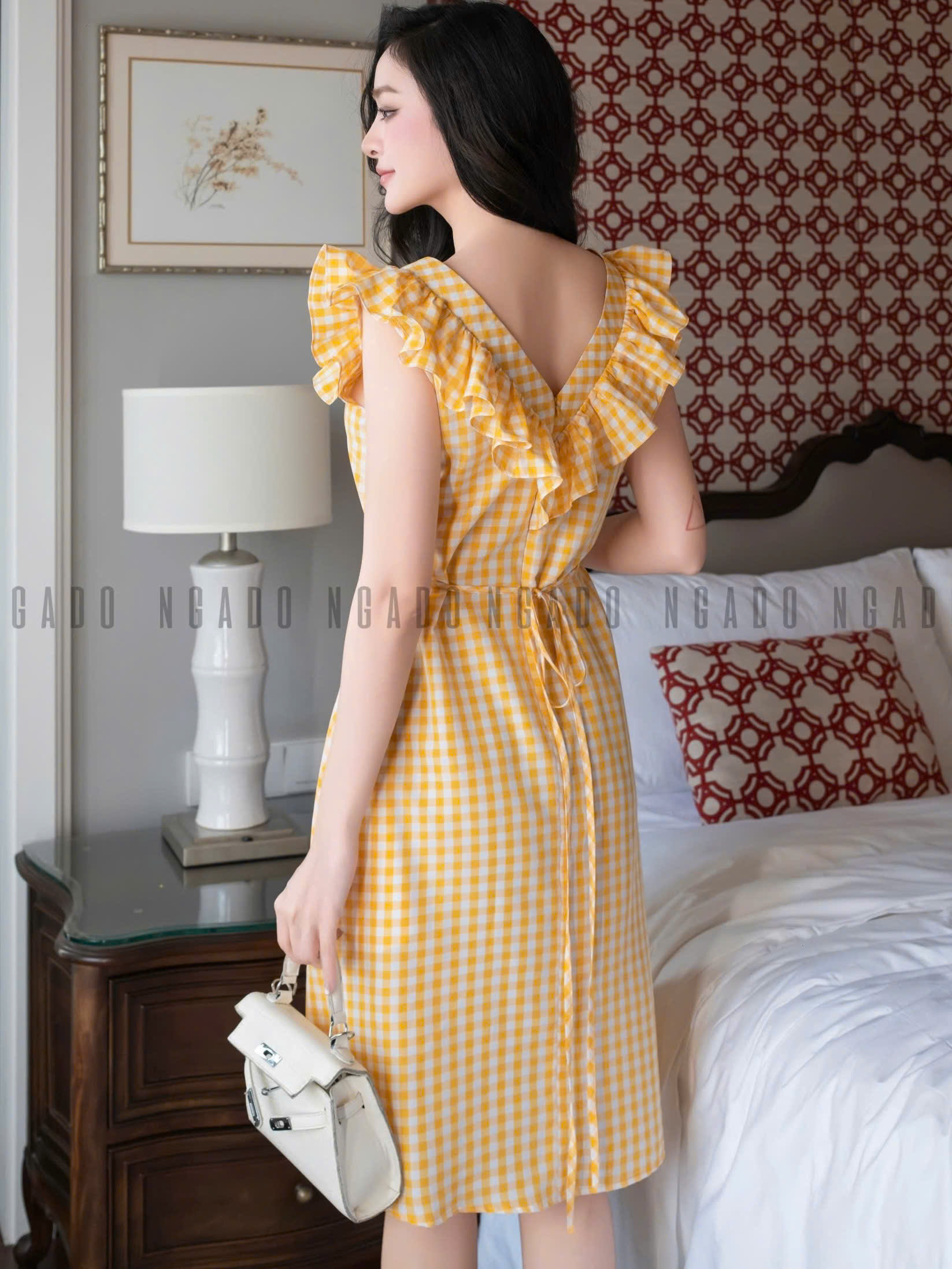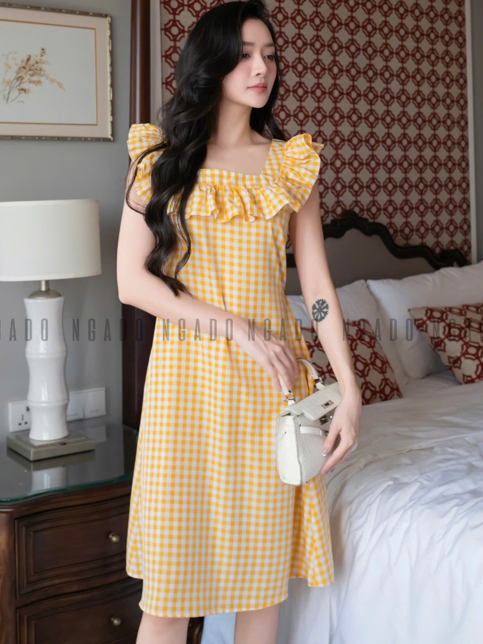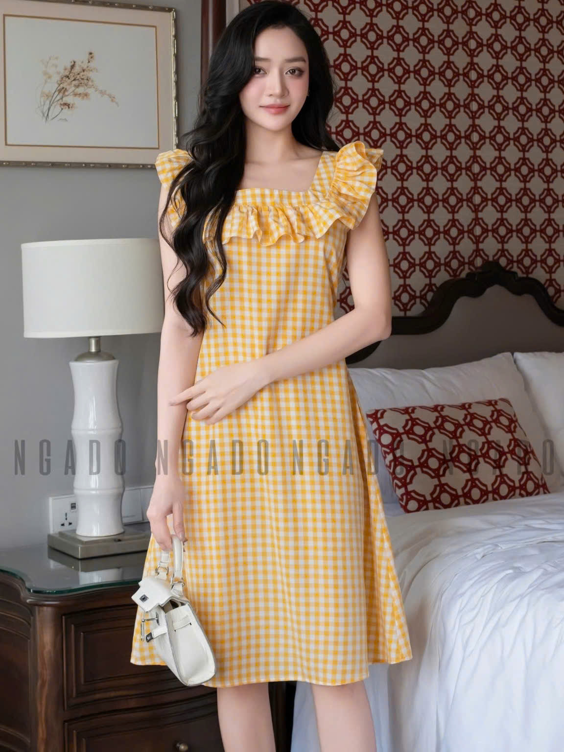 ✨Đầm caro vàng phối cổ nhún NGADO , đầm caro , đầm kẻ , đầm dạo phố