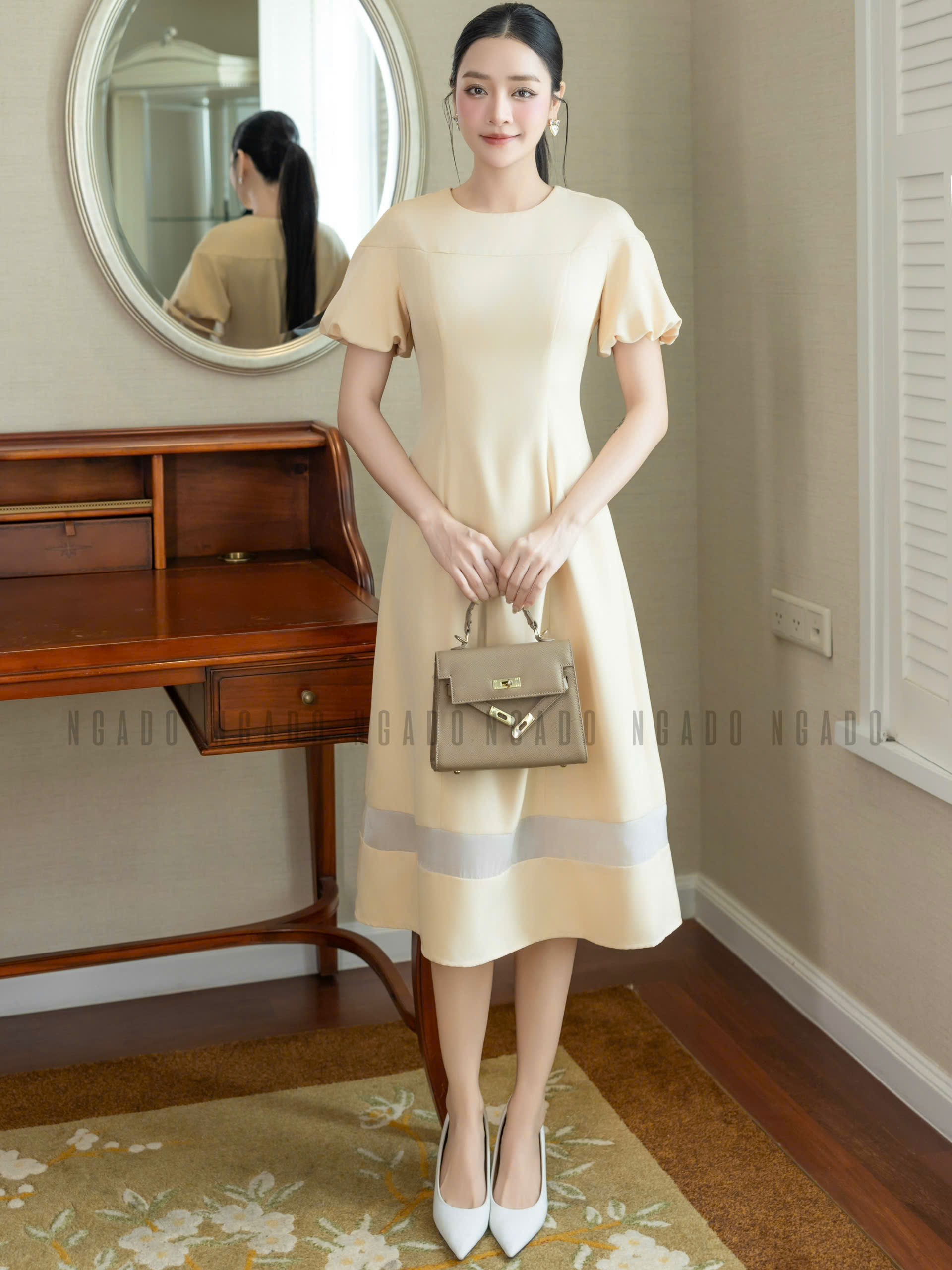 ✨Đầm kem dài cổ tròn NGADO , đầm dài , đầm cổ tròn