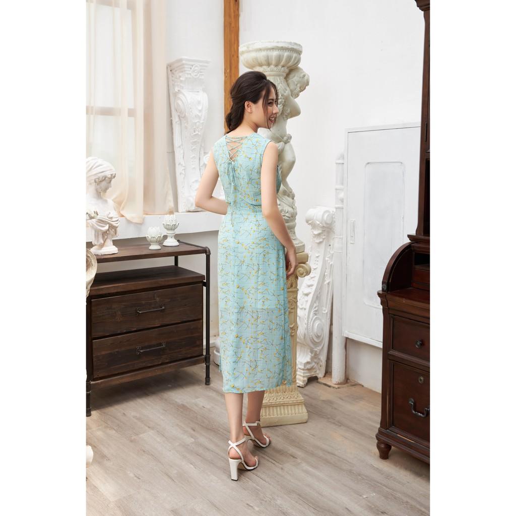 ✨Đầm maxi kẻ hoa Tri'C Luxury buộc dây lưng Xanh A20320