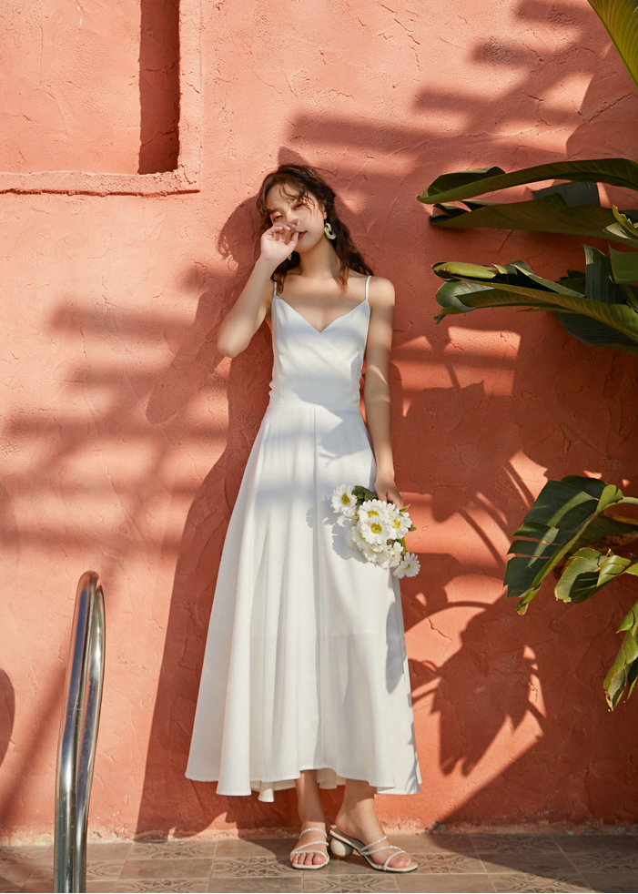 Mua tại Tiktok- Dạo bước trên bãi biển với chiếc váy lụa trơn, suông, trần lưng với điểm nhấn là chiếc nơ cực kì điệu đà.