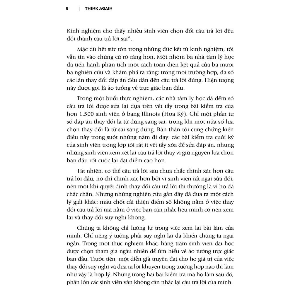 “Quyển sách phải đọc dành cho bất kỳ ai muốn tạo ra văn hóa học tập và khai phá, dù trong gia đình, ở nơi làm việc hay trong lớp học. Bằng sự nồng nhiệt và hài hước, Adam Grant chắt lọc những nghiên cứu công phu thành một lập luận đầy thuyết phục cho thấy tại sao ai cũng cần không ngừng chất vấn những giả định cũ và sáng tạo nên những ý tưởng và góc nhìn mới mẻ. Cuốn sách này chứa đựng những bài học quan trọng trong một thế giới ngày càng phân cực.”