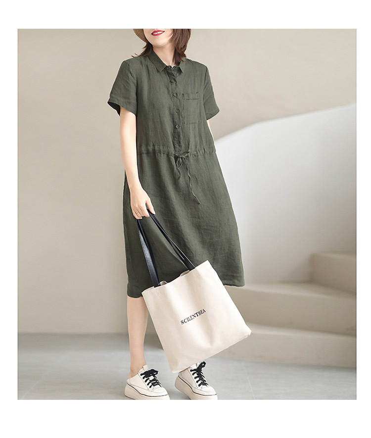 ✨Đầm sơ mi nữ form suông ngắn tay, Đầm đũi nữ cổ sơ mi kèm dây thắt eo màu rêu Da75