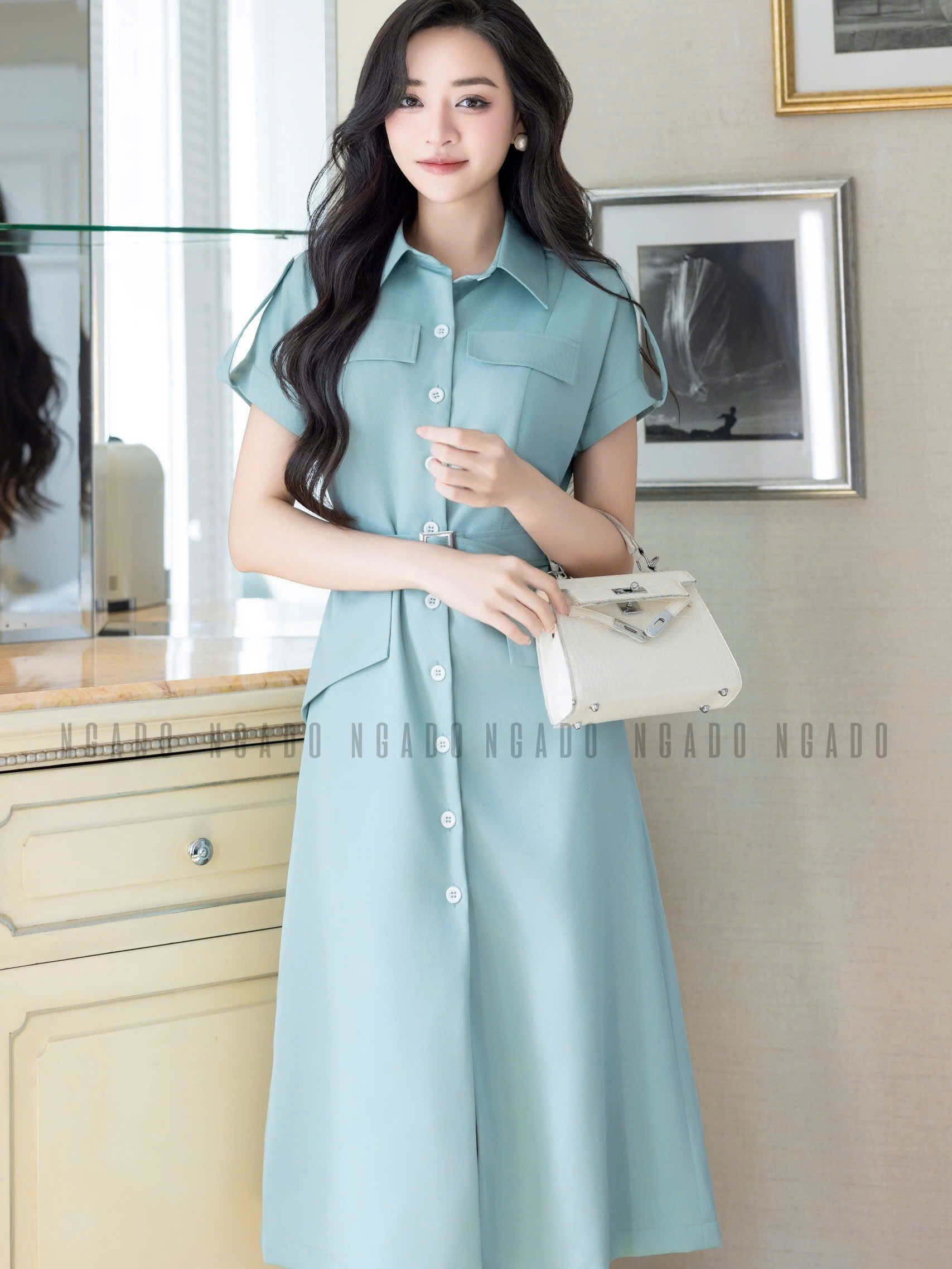 ✨Đầm sơ mi xanh mint NGADO , đầm công sở , đầm dự tiệc