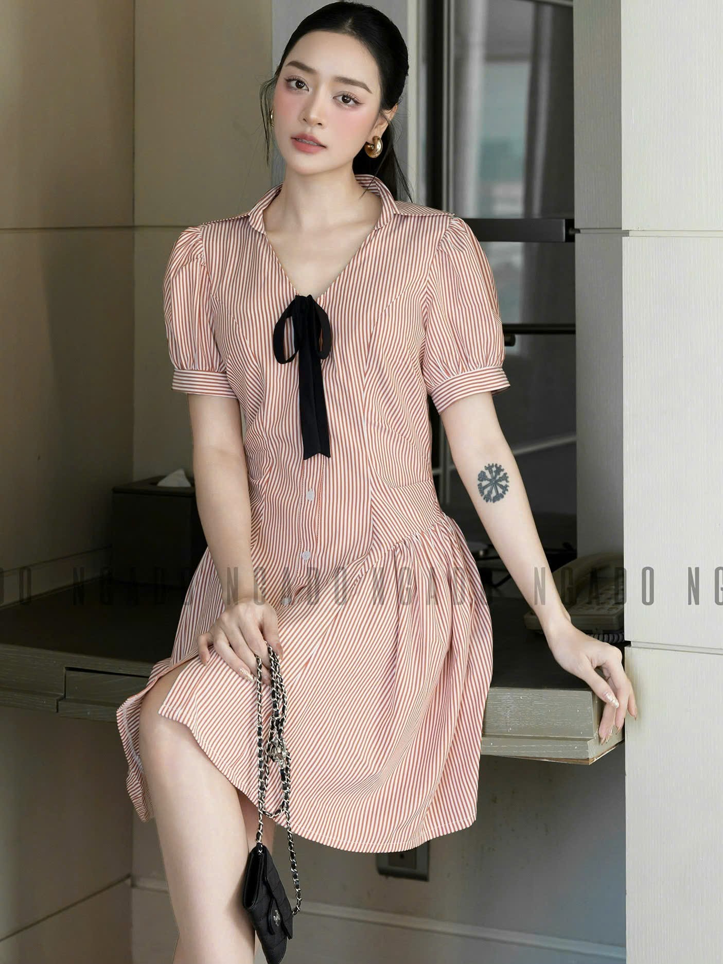 ✨Đầm sọc cam đính nơ NGADO , đầm kiểu Nữ , đầm kẻ sọc