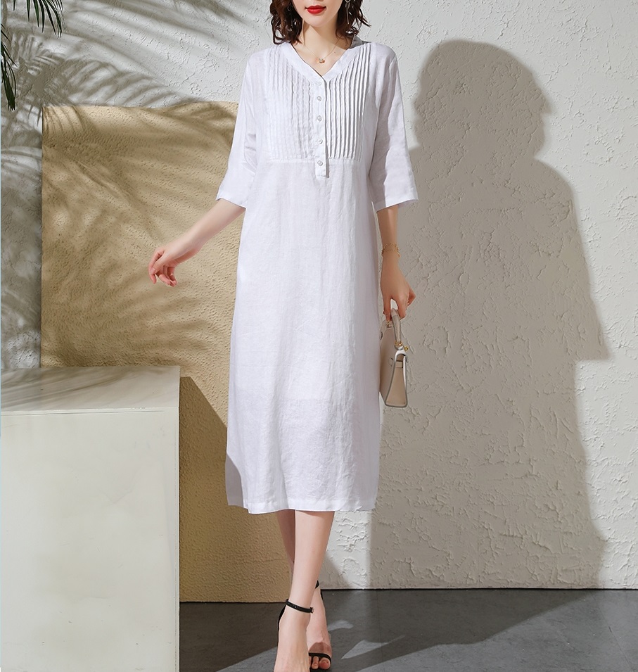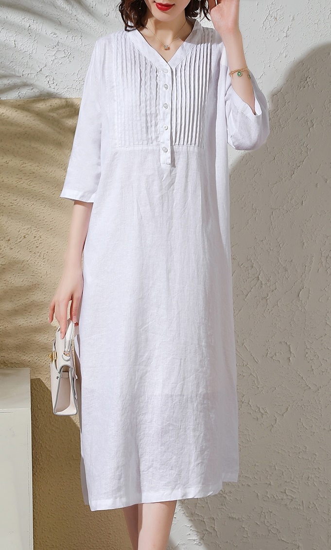 Đầm Sơ Mi Cotton, chất liệu cotton mềm mại, mỏng nhẹ. Phần trước ngực đính hạt tạo hình lá độc đáo. Mặc phối với quần short hoặc legging bên trong. Phom suông. Dài đầm 100cm