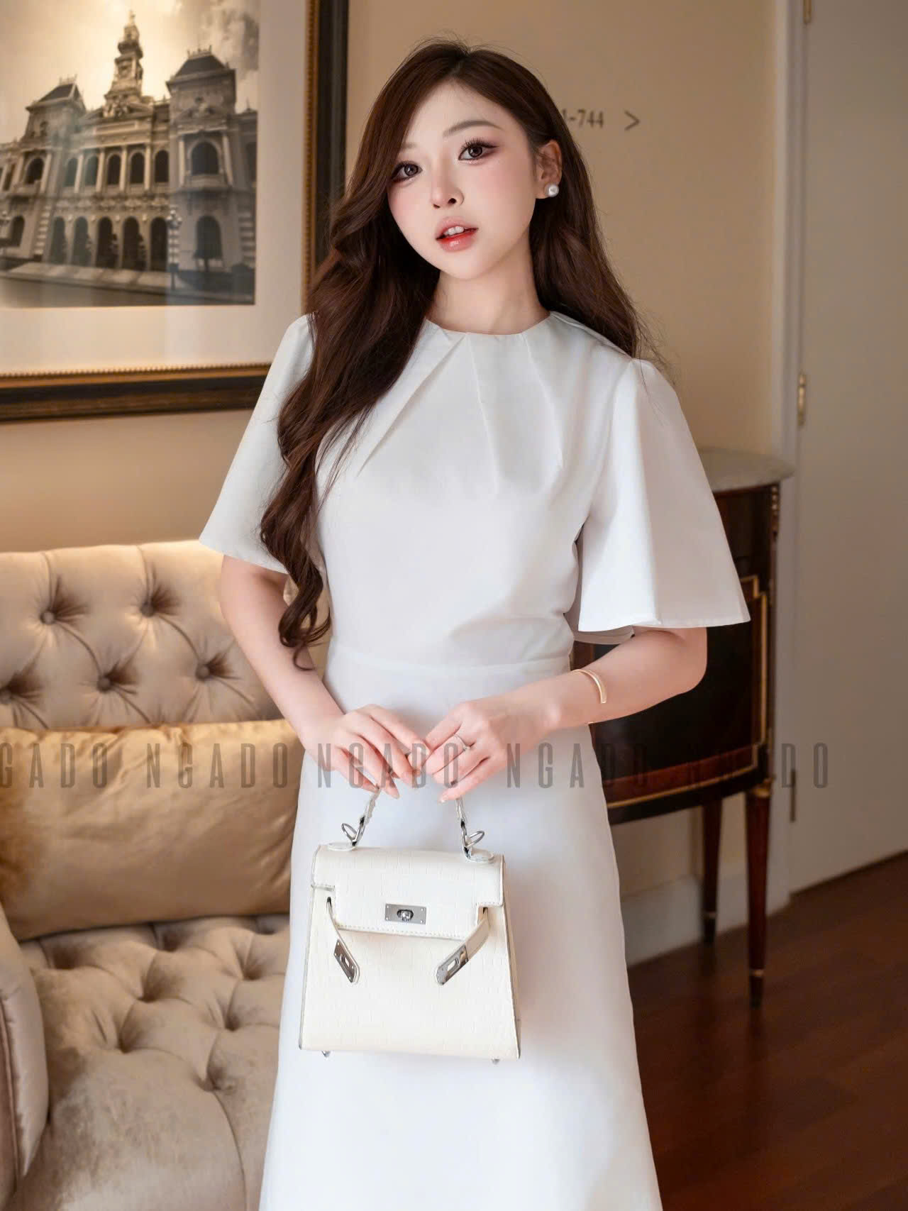 ღ THÔNG TIN SẢN PHẨM: Tên sản phẩm: Đầm trắng cổ xếp Màu sắc: trắng Chất liệu: Gấm trơn dày Chi tiết sản phẩm: không lót, không túi. Thông số