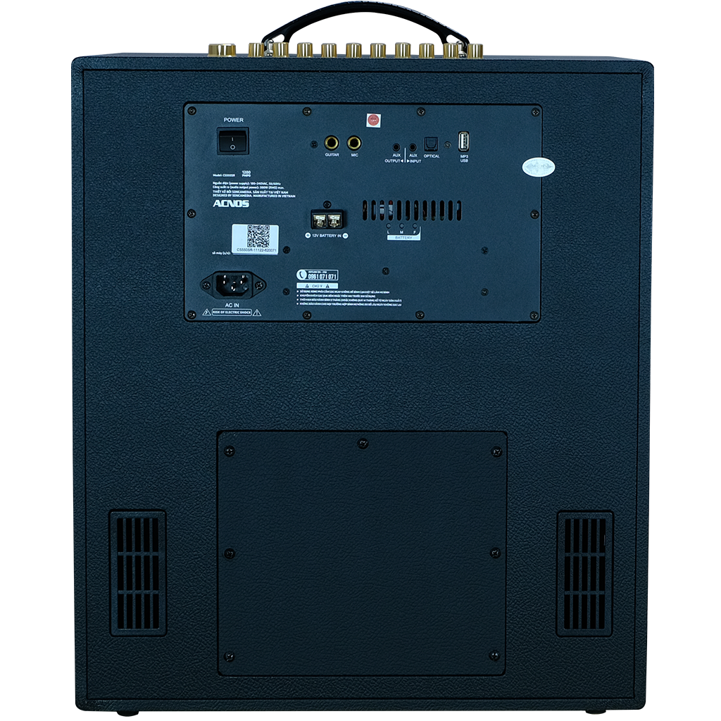 • Cổng kết nối : USB MP3, MIC, AUX INPUT, AUX OUT PUT, GUITAR (Jack 6.35mm), OPTICAL, Nguồn AC, 12V Battery In