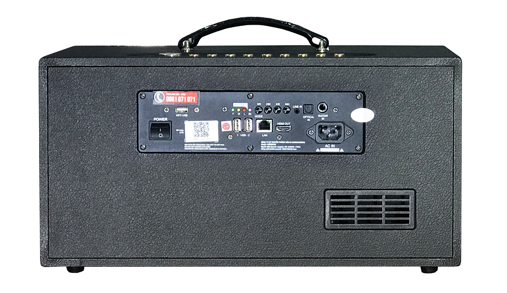 - Cổng kết nối : USB MP3, USB 1-2 (Khe cắm đầu phát tín hiệu điều khiển Remote), LAN/IR, LINE IN, LINE OUT, HDMI, OPTICAL, GUITAR (Jack 6.35mm), Nguồn AC