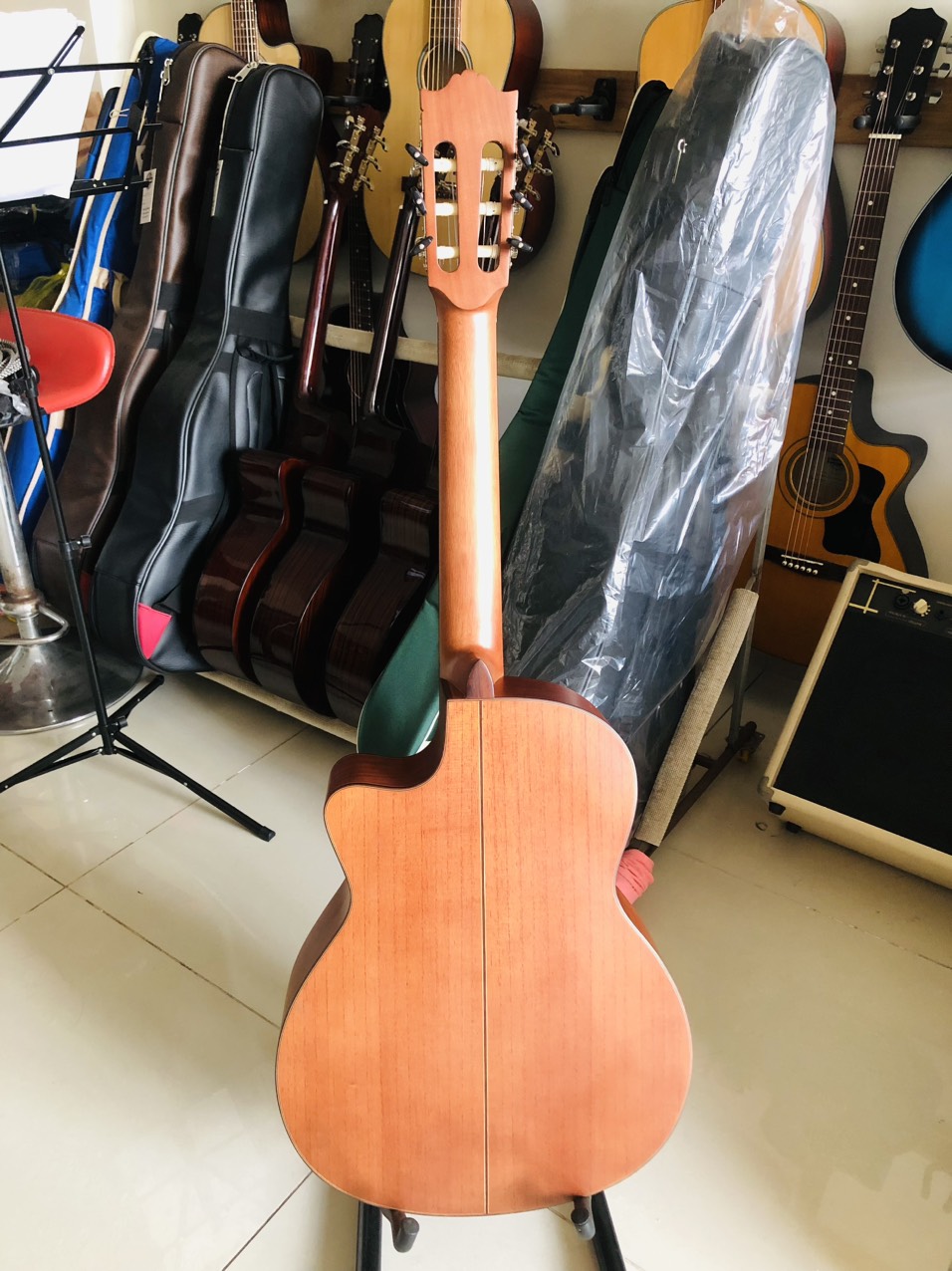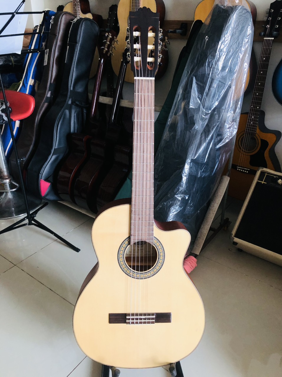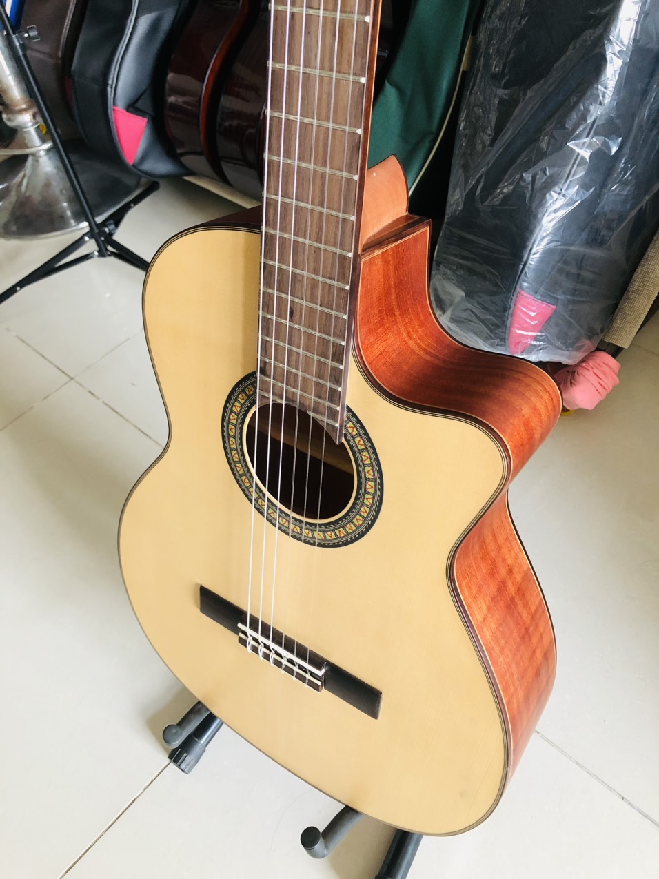 - Thùng đàn Full size , dáng A có cutaway - khuyết, Guitar classic có action vừa phải giúp bấm êm tay và quạt chả không rè dây