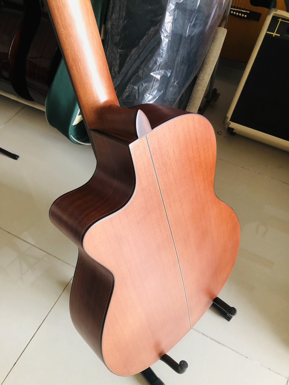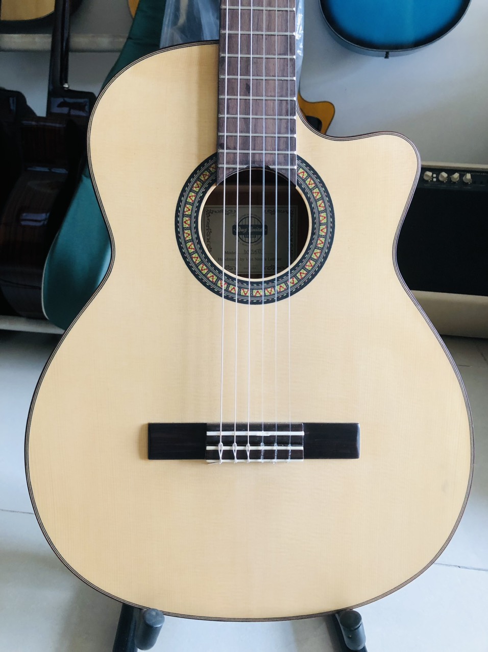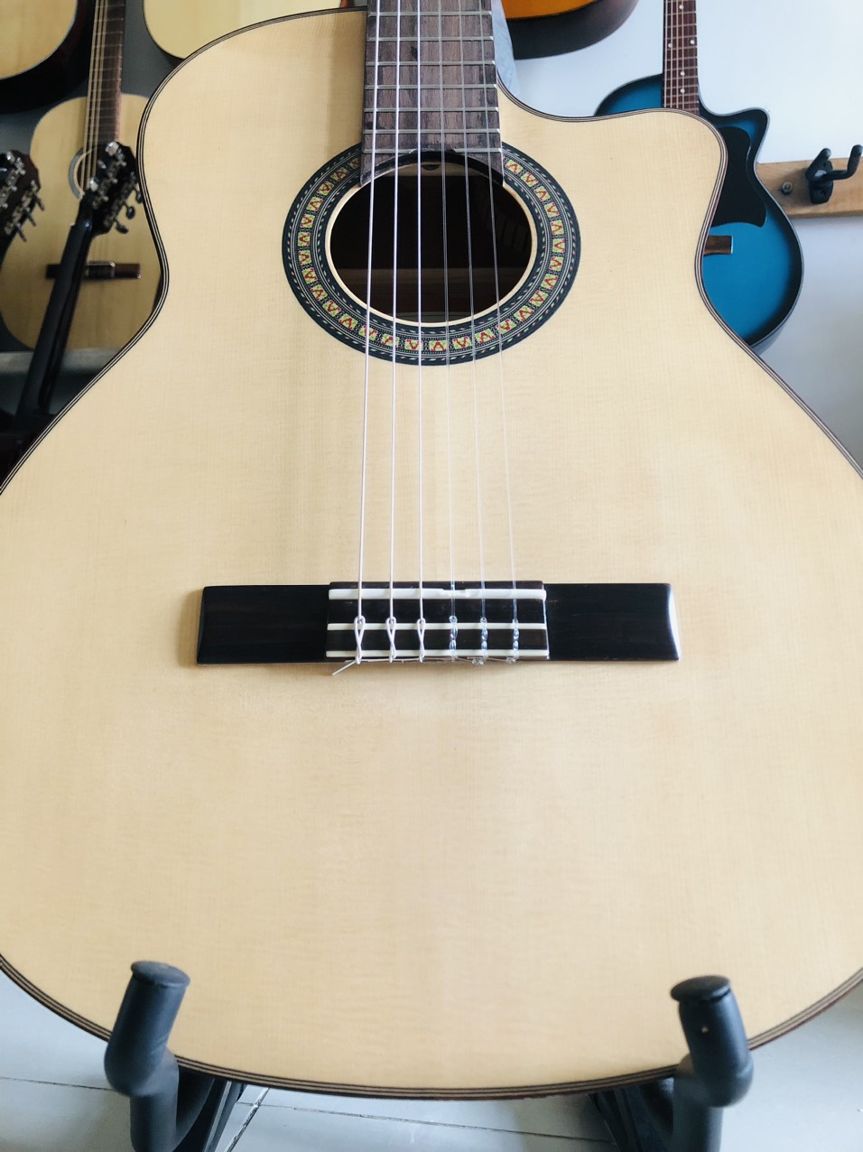- Thùng đàn Full size , dáng A có cutaway - khuyết, Guitar classic có action vừa phải giúp bấm êm tay và quạt chả không rè dây