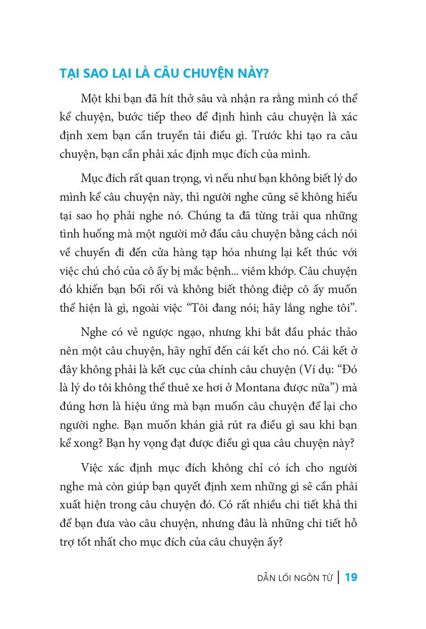Nghệ thuật kể chuyện không chỉ để khuấy động không khí cho đám đông mà còn là công cụ hữu ích cho cuộc sống. Ví dụ khi bạn đang tham dự một cuộc họp kinh doanh, một câu chuyện sẽ giúp bạn nhấn mạnh quan điểm của mình hơn rất nhiều; một câu chuyện cũng rất cần thiết để kêu gọi tình nguyện viên cho một tổ chức. Cho dù bạn đang kể chuyện cho bạn bè, sếp, khách hàng hay thậm chí một người xa lạ, quyển sách “Dẫn lối ngôn từ” cũng sẽ giúp ích cho bạn. Bạn sẽ nhận ra rằng: Đúng, bạn có thể kể chuyện.