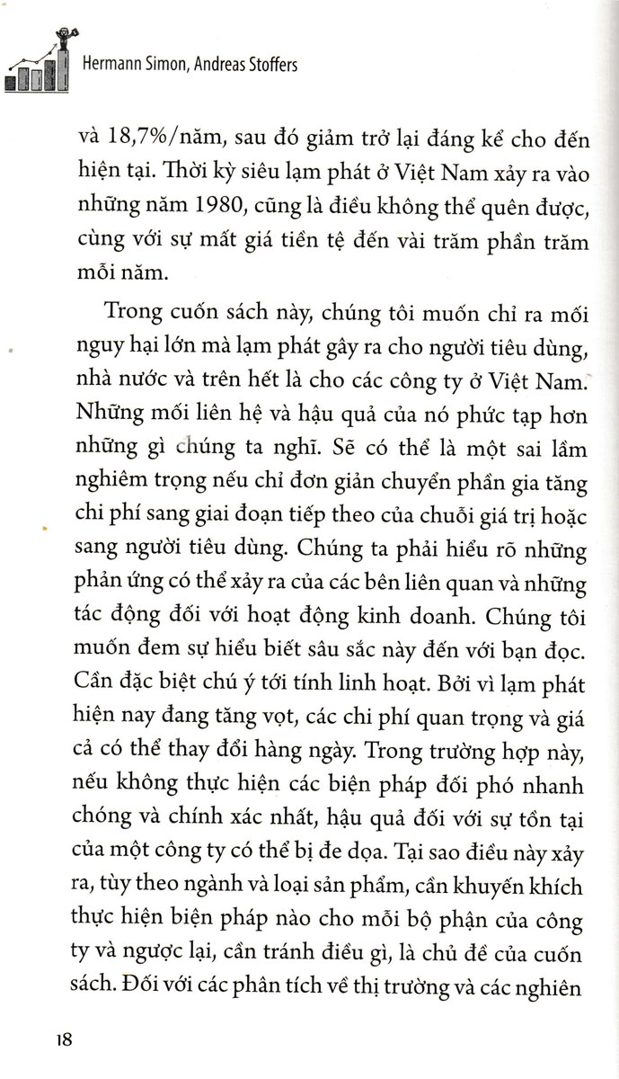 Đánh Bại Lạm Phát   Lạm phát không thể kiểm soát có phải một điều bình thường mới? - Lạm phát đã trở lại và sẽ còn tiếp diễn. Đối với các công ty Việt Nam, điều này có nghĩa là thế giới kinh doanh của họ đã thay đổi về cơ bản. Cuốn sách Đánh bại lạm phát – linh hoạt, cụ thể, hiệu quả nhìn vào lạm phát từ các góc độ khác nhau. Nó đề xuất các biện pháp và chiến lược về cách các doanh nghiệp có thể đối phó và quản lý lạm phát để đảm bảo cho sự tồn tại của họ. Đối với doanh nghiệp và người tiêu dùng Việt Nam, vấn đề không phải là loại bỏ lạm phát mà là đối phó với lạm phát theo cách ngăn chặn tổn thất ở mức ít nhất có thể. Điều này không chỉ bao gồm việc quản lý giá mà còn bao gồm các hoạt động bán hàng, tài chính, mua hàng, quản lý chi phí, số hóa và đổi mới. Nó cũng bao gồm sự thay đổi văn hóa doanh nghiệp, nếu được kiểm soát nhanh chóng và thành công, họ sẽ có cơ hội tốt để đánh bại lạm phát và từ đó đảm bảo sự tồn tại của công ty.