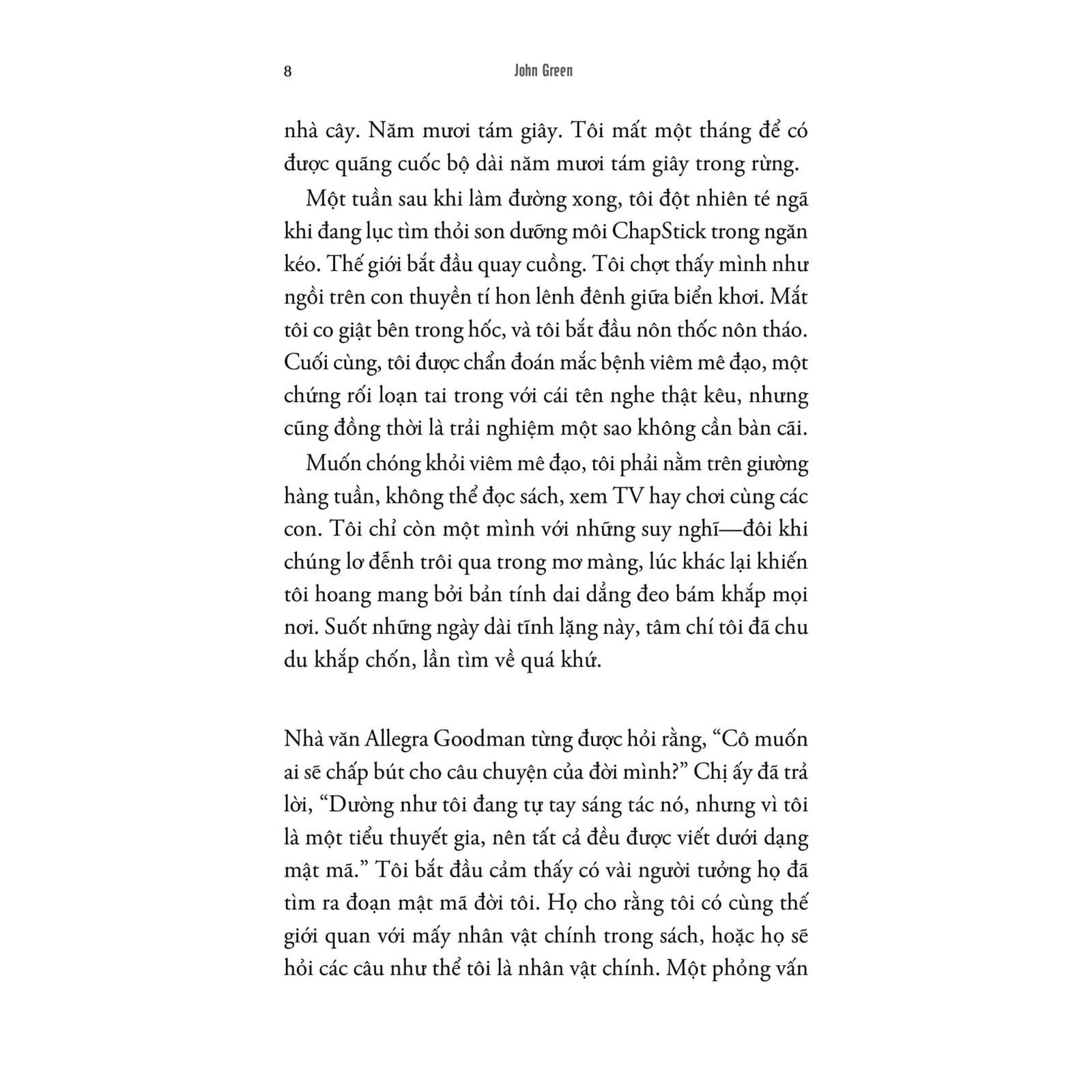 Các bài viết trong "Đánh giá kỷ nhân sinh" một lần nữa cho thấy tài kể chuyện hiếm có của John Green. Tác phẩm là cuộc hành trình khám phá đầy cảm hứng về những con đường mà chúng ta đã khai mở, đồng thời là một lời tụng ca chân thành về tình yêu dành cho thế giới.