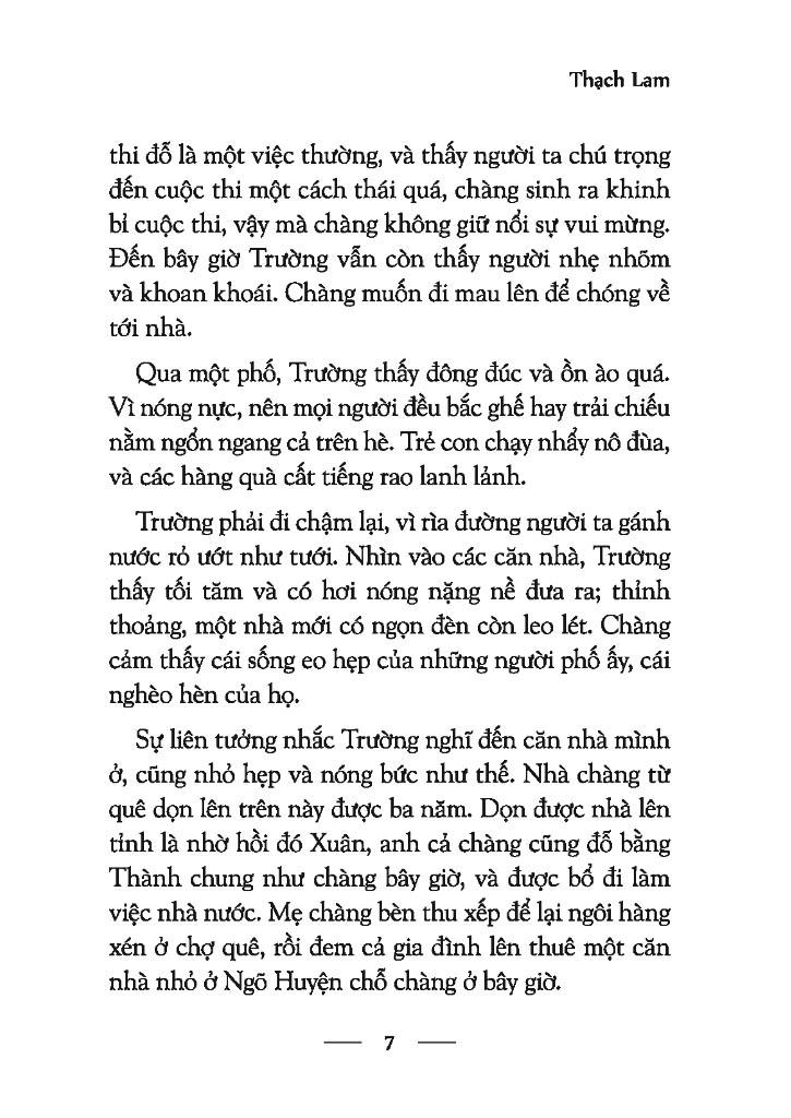 "Trường khẽ thở dài. Trong cái vui của lòng chàng, Trường muốn cho anh chị cũng được sung sướng. Chàng hiểu những nỗi đau đớn mà Dung đã phải chịu vì thái độ lãnh đạm của Xuân. Tuy vậy, giờ nghĩ đến anh, Trường không thấy bực tức như trước nữa. Sự thay đổi của Xuân gần đây, chàng đã đoán biết những duyên cớ. Có lẽ Xuân cũng đã có những hành vi và ý nghĩ của m.ình. Xuân, không có can đảm trở về với cuộc đời chàng có, với những vui và những buồn của sự sống hằng ngày."