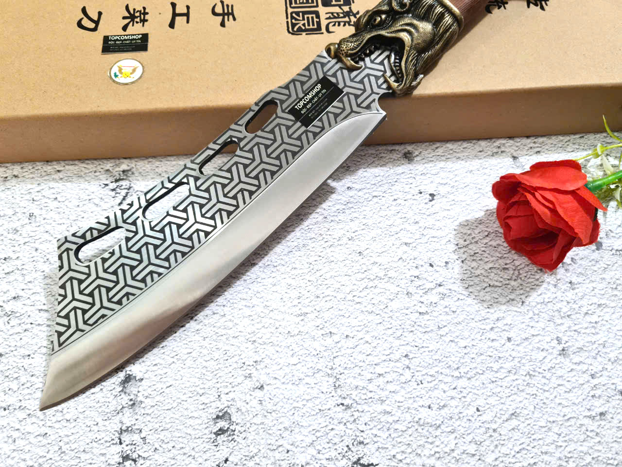 - DAO TR12 : Chiều dài TỔNG: 45cm Chiều dài lưỡi: 24.5cm Chiều rộng lưỡi: 7.5cm, Độ dày lưỡi: 6mm Trọng lượng: 1kg chất liệu lưỡi : 7Cr17MOV (thép 7 crom 17 molypden vanadi) Chất liệu tay cầm: gỗ cẩm lai, phụ kiện khâu đầu hổ và chuôi bằng đồng