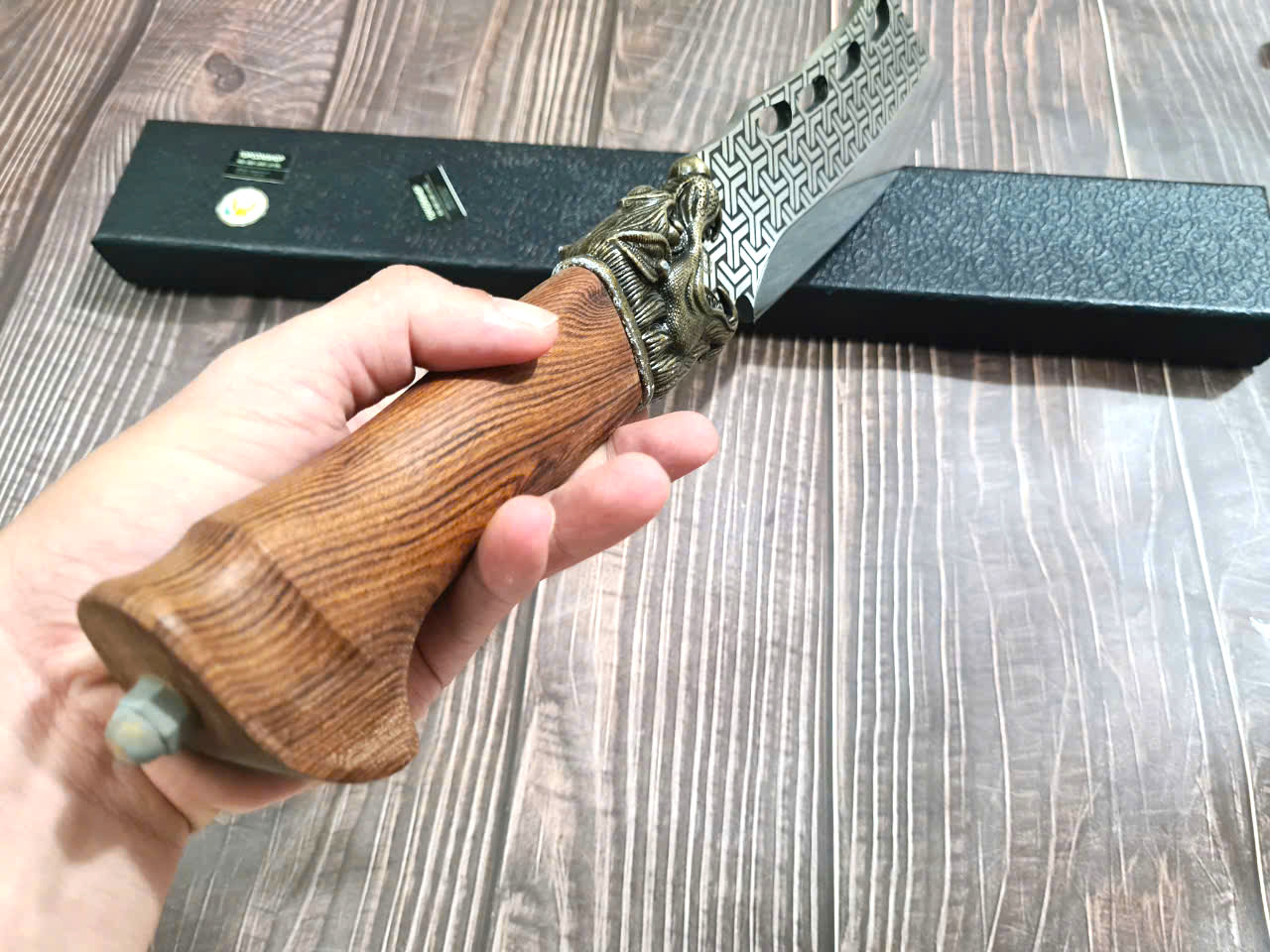 - Chức năng: chuyên chặt thái cá, chặt gà, lọ - Kích thước: Lưỡi: 26cm, cán: 12,5cm, rộng: 6,5cm, dầy: 4ly, trọng lượng: 480g - Cán : Gỗ mun , Khâu và chốt đồng đỏ