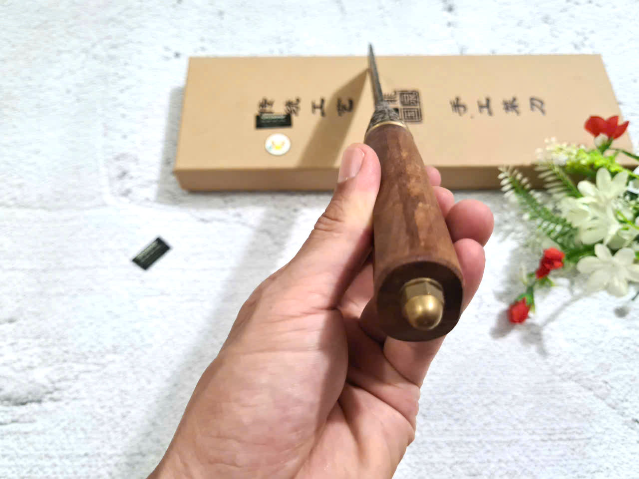 Chất liệu tay cầm: gỗ cẩm lai, khâu và chuôi cuối dao bằng đồng thau
