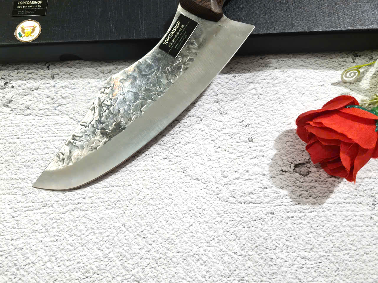 -THÔNG TIN SẢN PHẨM: Chiều dài tổng thể: 29.5cm, Chiều dài lưỡi: 19.5cm ,Chiều rộng lưỡi: 5cm Độ dày: 2.5MM, CHẤT liệu lưỡi: 5Cr15MOV (thép 5 crom 15 molypden vanadi) Chất liệu CÁN: gỗ Cánh gà NẶNG : 2.5 lạng Mặt D dập chìm hoa văn rất đẹp