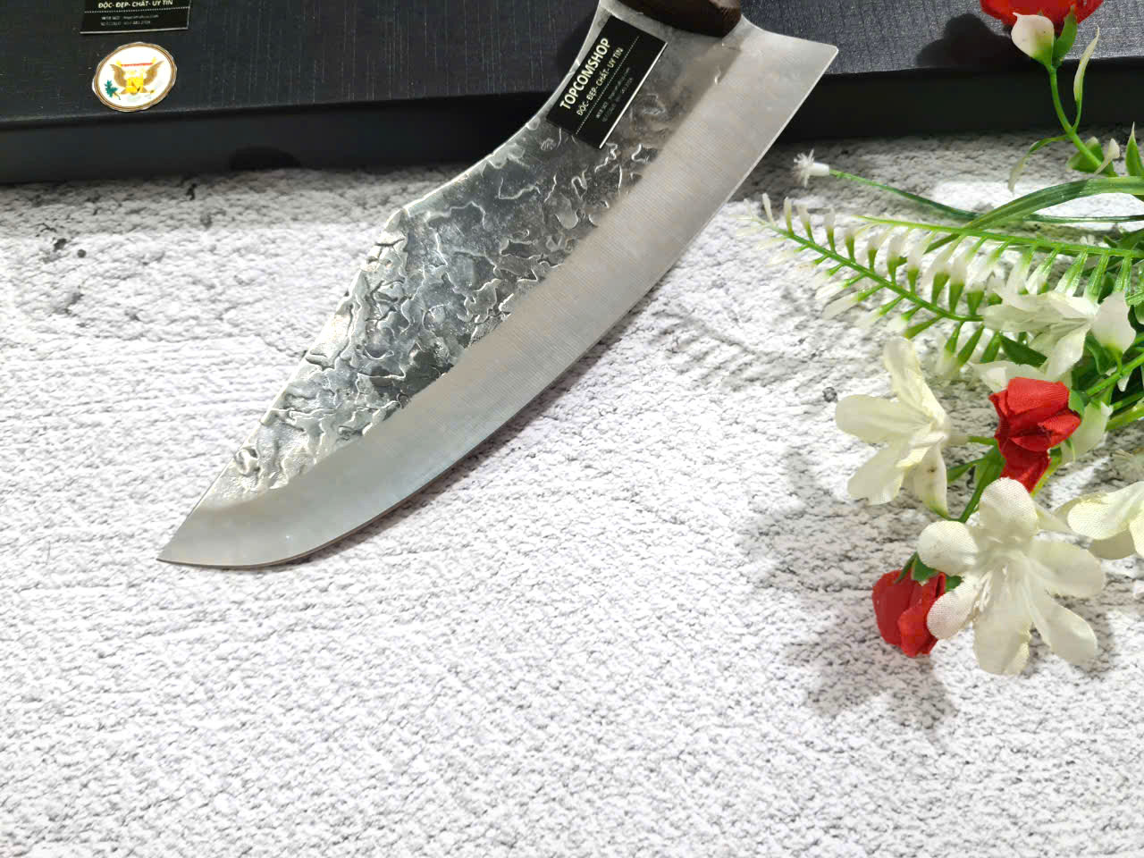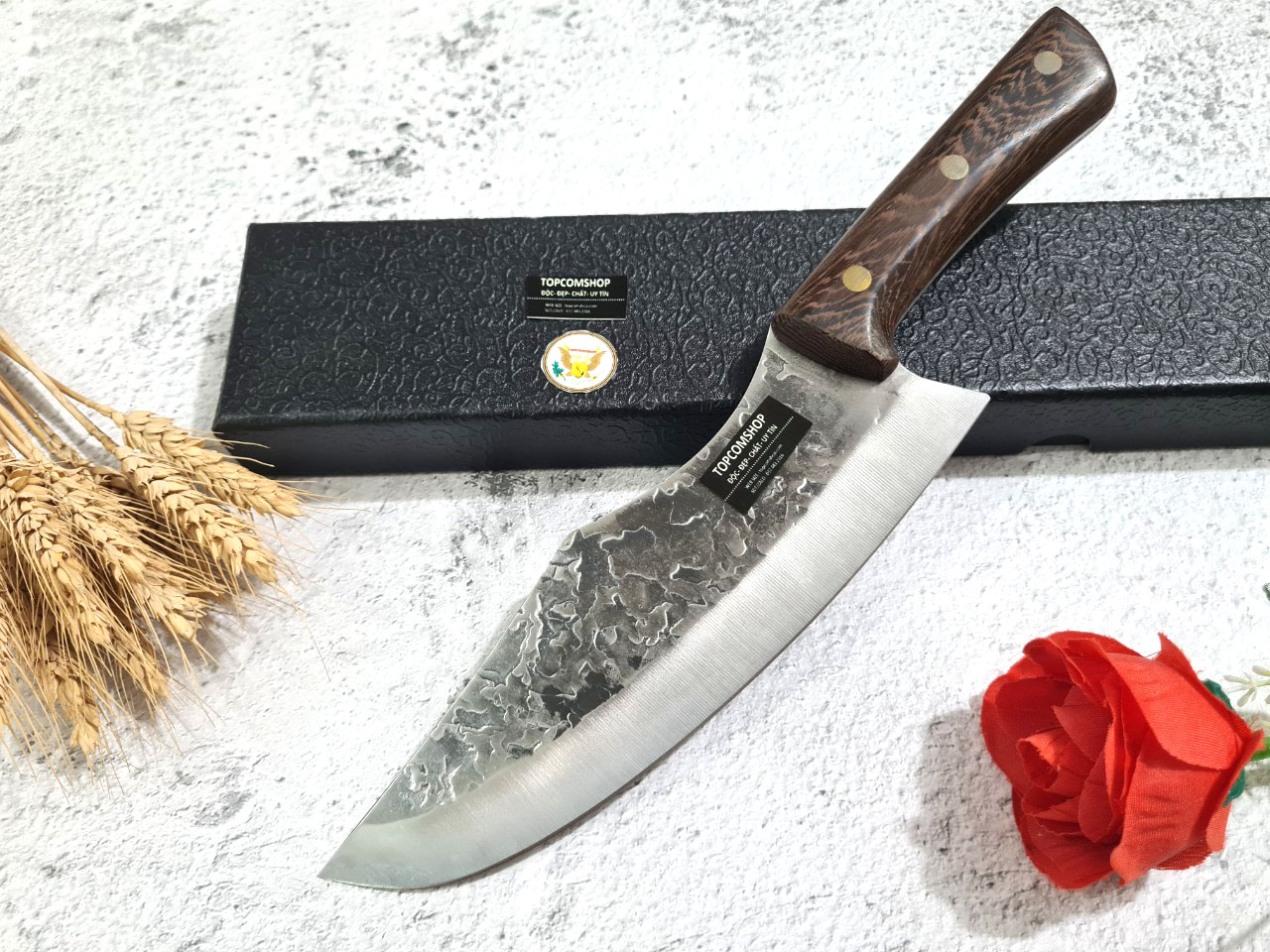 -THÔNG TIN SẢN PHẨM: Chiều dài tổng thể: 29.5cm, Chiều dài lưỡi: 19.5cm ,Chiều rộng lưỡi: 5cm Độ dày: 2.5MM, CHẤT liệu lưỡi: 5Cr15MOV (thép 5 crom 15 molypden vanadi) Chất liệu CÁN: gỗ Cánh gà NẶNG : 2.5 lạng Mặt D dập chìm hoa văn rất đẹp