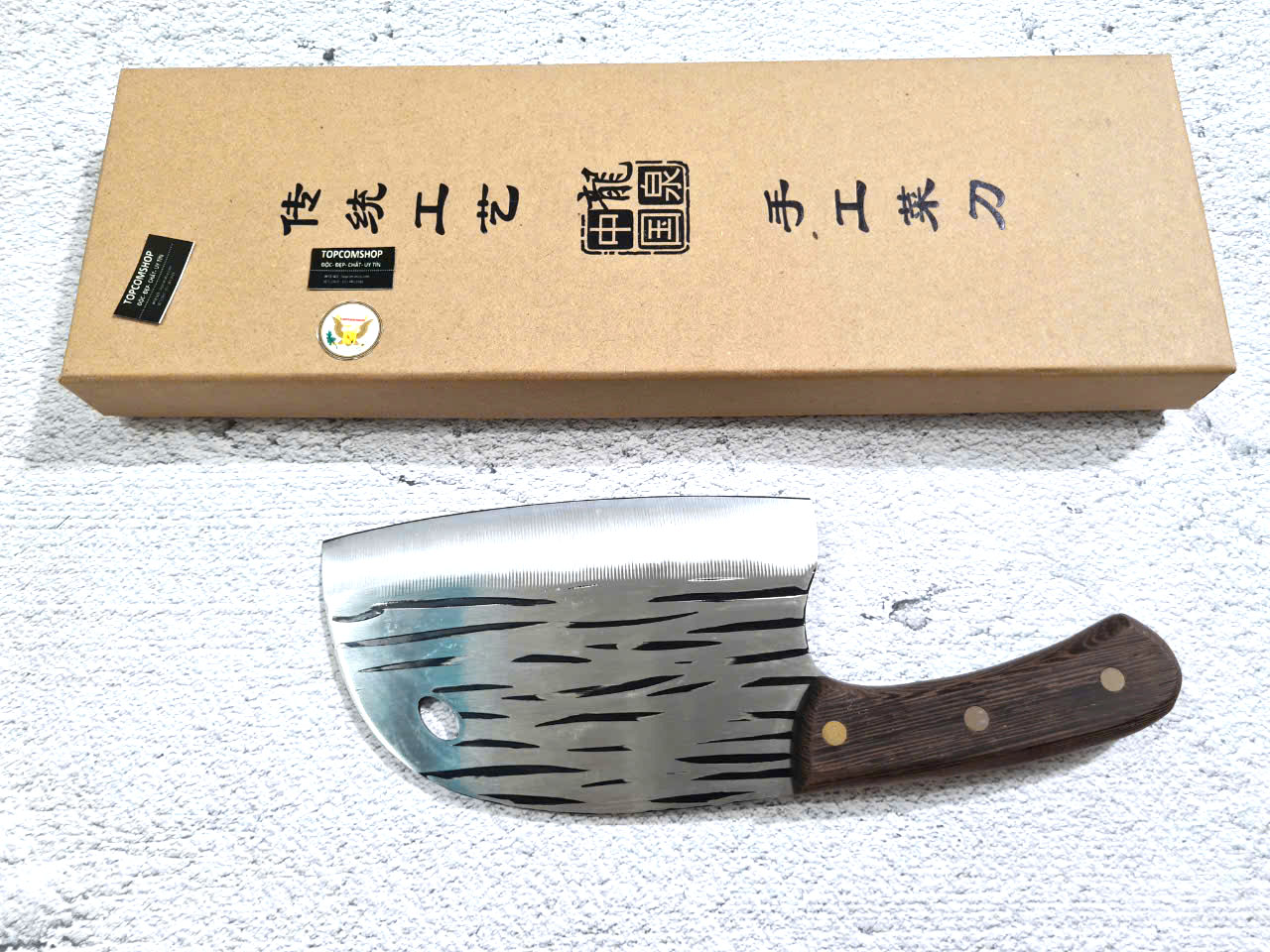 - Chức năng: Chặt xương ống, chân giò, trâu bò - Kích thước: Lưỡi: 22cm, cán: 10cm, rộng: 10cm, dầy: 5ly, trọng lượng: 800g - Cán : Gỗ mun, Khâu đồng đỏ , chốt đinh