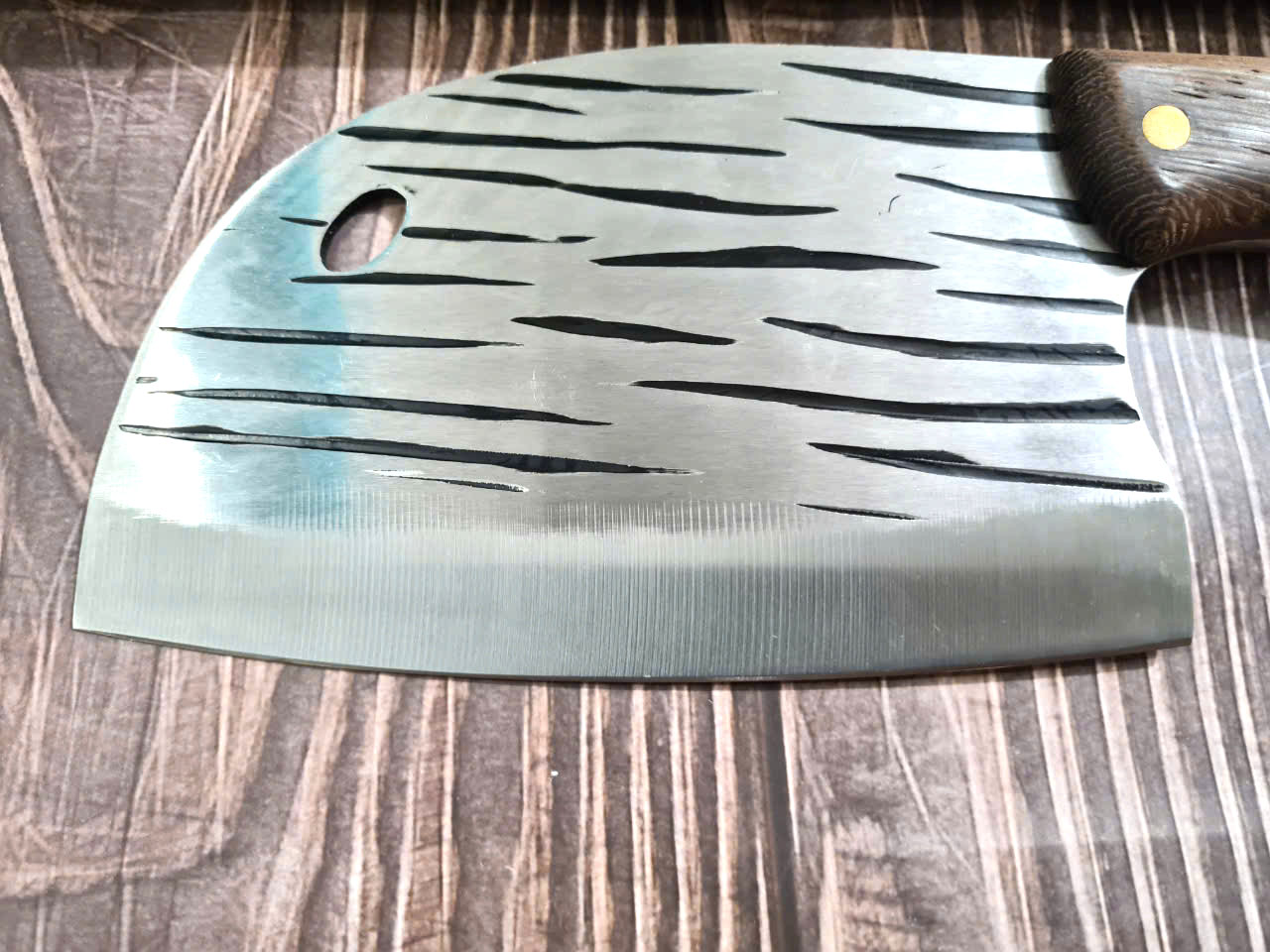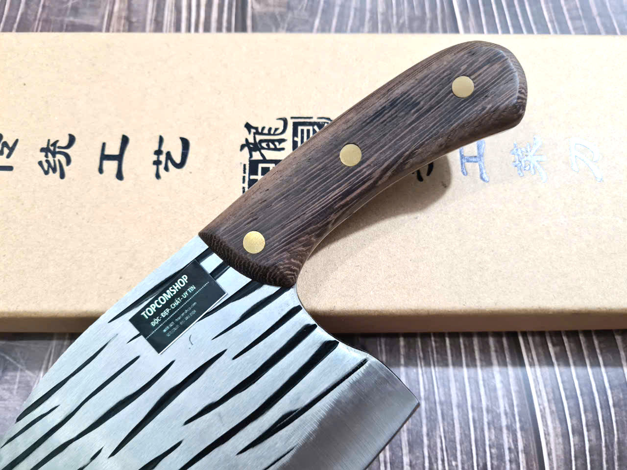 - Chức năng: Chặt xương ống, chân giò, trâu bò - Kích thước: Lưỡi: 22cm, cán: 10cm, rộng: 10cm, dầy: 5ly, trọng lượng: 800g - Cán : Gỗ mun, Khâu đồng đỏ , chốt đinh