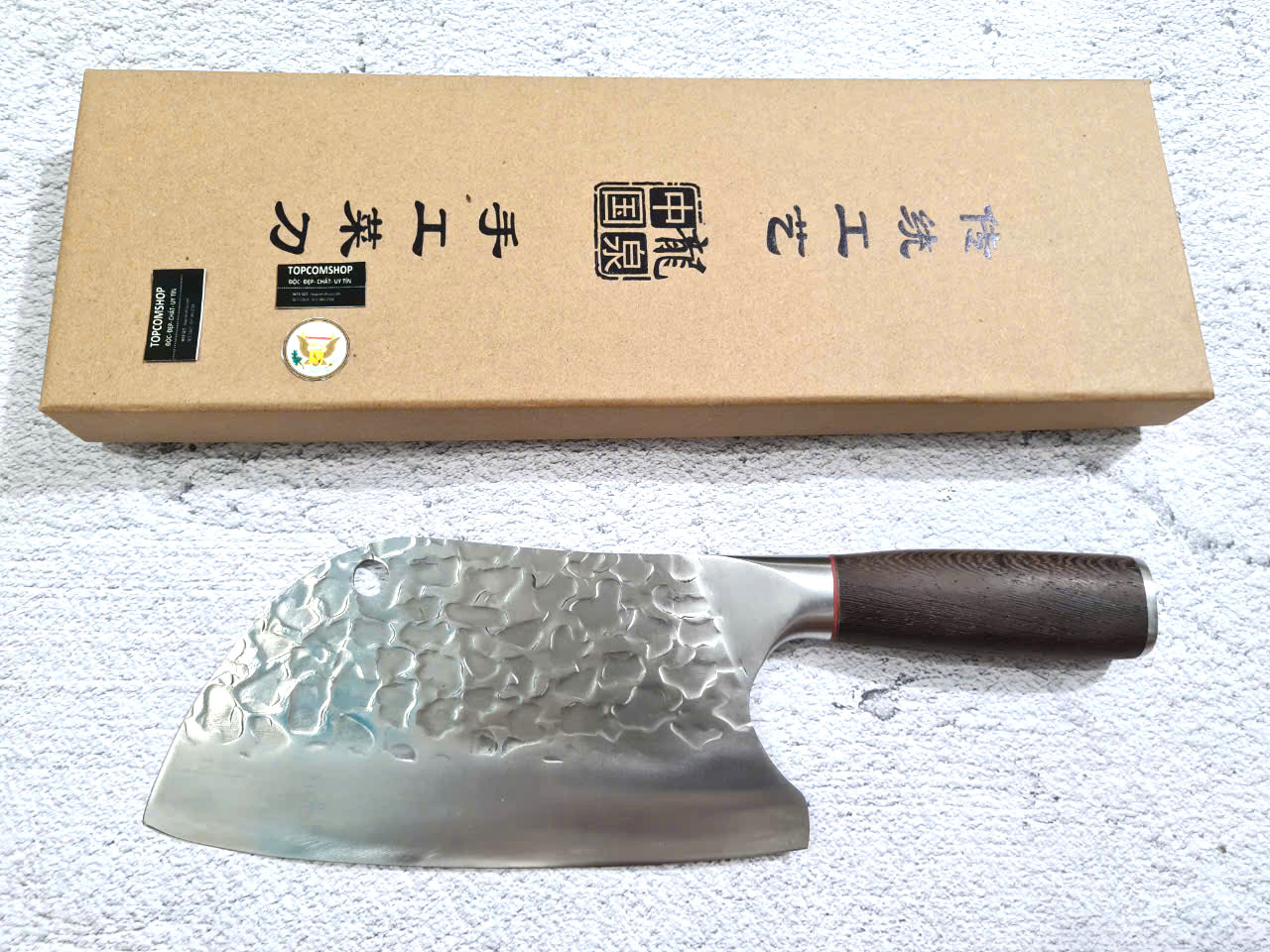 - Chức năng: Chặt xương ống, chân giò, trâu bò - Kích thước: Lưỡi: 22cm, cán: 10cm, rộng: 10cm, dầy: 5ly, trọng lượng: 800g - Cán : Gỗ mun, Khâu đồng đỏ , chốt đinh