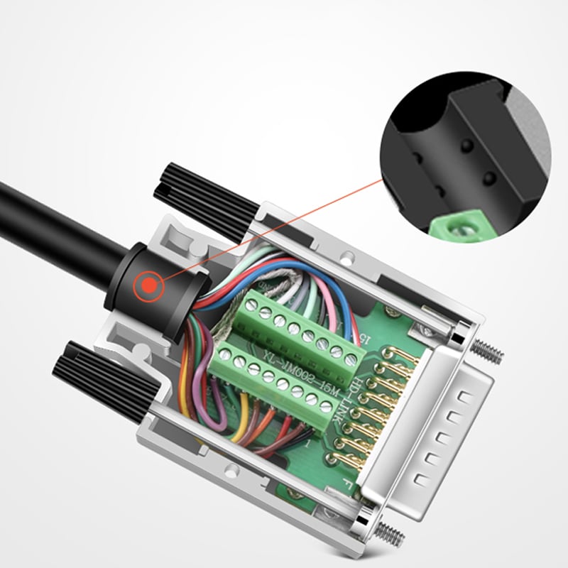 - Đầu bấm dây DB15, sẽ giúp cho việc thực hiện hoàn thanh nhanh chóng 1 Cáp DB15 nhanh chóng, chính xác, nhờ vào việc siết ốc bên trong bản mạch PCB. Người sử dụng có thể vặn nhẹ các ốc vít bên trong để nhấc đầu dây và chuyển thành đầu giao tiếp khác, DB15 đực sang DB15 cái, hoặc DB15 cái sang DB15 cái.v.v. Hoặc theo sơ đồ đấu nối của môt số thiết bị yêu cầu.