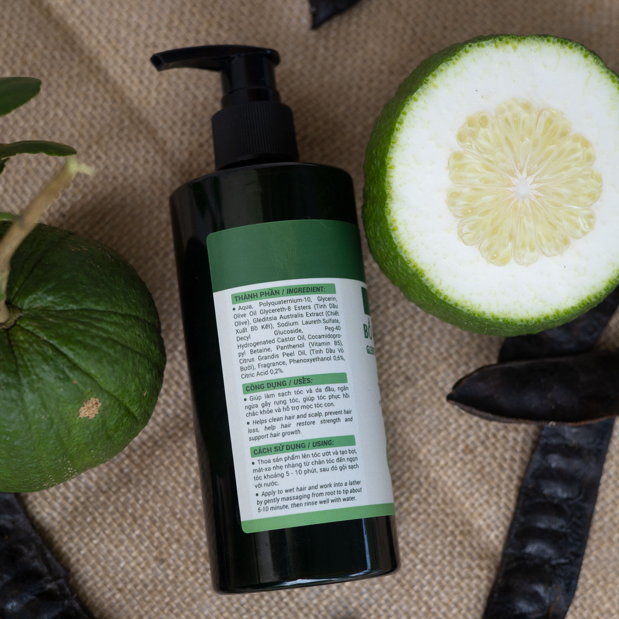 Từ tinh dầu vỏ bưởi Việt Nam truyền thống kết hợp với vitamin B5, hoạt chất dưỡng ẩm Xylishine cùng công thức dịu nhẹ không chứa sulfate, dầu gội bưởi giúp làm sạch tóc và