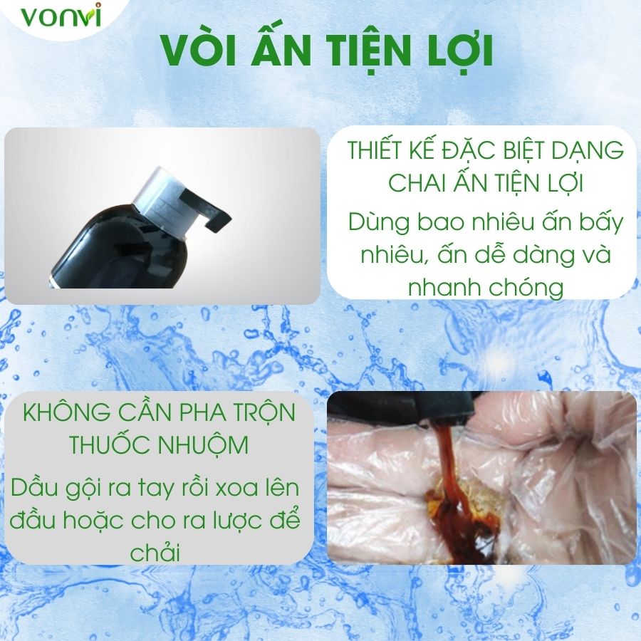 BẠN ĐANG GẶP PHẢI CÁC VẤN ĐỀ SAU: () Mái tóc bạn bị bạc, xơ, phai màu khiến cho bạn nhìn già, xấu hơn so với hội bạn cùng tuổi. () Bận rộn cả ngày không có thời gian rỗi để đến salon làm đẹp cho mái tóc của mình. () Sợ sử dụng các loại t h u ố c nhuộm có chứa các hóa chất gây hại cho mái tóc và da đầu. () Không tự làm đen mái tóc của mình mà lại cần thêm người giúp đỡ mỗi khi gội đen tóc. () Mất tự tin vì bị tóc bạc quá nhiều khi đi họp lớp hoặc nơi đông người. ƯU ĐIỂM VƯỢT TRỘI của dầu gội phủ bạc VONVI dạng chai ấn () KHÔNG Amoniac, KHÔNG cần pha trộn t.h.u.ố.c nhuộm. () KHÔNG gây kích ứng da, KHÔNG làm đen da đầu, KHÔNG gây xót da đầu () KHÔNG làm tổn thương cho tóc và da đầu, KHÔNG làm thay đổi cấu trúc của tóc. () Dạng chai ấn rất tiết kiệm, dùng bao nhiêu thì ấn ra bấy nhiêu. () Sử dụng DỄ DÀNG chỉ cần ẤN và XOA. () KHÔNG cần đến Salon tóc. () Lên màu ĐEN TỰ NHIÊN bóng rạng sau 10 phút. () An toàn cho mọi lứa tuổi. THÀNH PHẦN của dầu gội phủ bạc VONVI làm tóc đen dạng chai ấn () Dầu gội phủ bạc VONVI với thiết kế lược chải thông minh thế hệ mới 1 nút ấn sẽ đem lại cho người dùng sự tiện lợi vô cùng, thao tác nhanh, dễ sử dụng giúp bạn lên màu đều và đẹp chỉ trong vòng 10 phút. () Dầu gội phủ bạc nhà VON #vonvi được chiết xuất từ các loại thảo dược thiên nhiên chính có tác dụng tạo màu tóc và dưỡng tóc như: Hà Thủ Ô, Nhân Sâm, Nấm linh chi, Cỏ mực, Nha đam, Hoa đậu biếc và dầu bơ…. HƯỚNG DẪN SỬ DỤNG dầu gội phủ bạc nhà VONVI làm đen tóc dạng chai ấn () Bước 1: Rút nắp vòng nhựa trắng và nút nhựa đen ở đầu vòi ấn ra. Đeo găng tay trước khi sử dụng sản phẩm. Ấn vòi nhấn xuống để lấy một lượng dầu gội phù hợp ra lòng bàn tay. () Bước 2: Sau đó xoa lượng dầu gội vừa lấy ra lên chỗ tóc bị bạc/trắng, dùng tay xoa đều. Mát xa nhẹ để đảm bảo dầu gội được phủ tới hết các sợi tóc trắng/bạc bên trong mái tóc.  () Bước 3: Ủ tóc trong khoảng thời gian từ 10 tới 15 phút tùy theo số lược tóc bạc/trắng cần phủ bạc. Sau đó xả lại với nước ấm (có thể dùng thêm dầu xả nếu cần), lau khô tóc và lúc này Quý khách đã có 1 mái tóc với màu ĐEN TỰ NHIÊN và bóng mượt. Lắp lại nắp vòng nhựa trắng và nút nhựa đen ở đầu vòi ấn. Cất đi và sử dụng tiếp cho lần sau. THÔNG TIN KHÁC: () Thương hiệu: VONVI () Xuất xứ: Việt Nam. () Màu: ĐEN TỰ NHIÊN () Hạn sử dụng: 03 năm từ ngày sản xuất. () Nếu dầu gội dính ra tay, chán thì lấy khăn ướt lau ngay đi. () Bảo quản sản phẩm ở nơi khô ráo, thoáng mát, tránh ánh nắng trực tiếp.