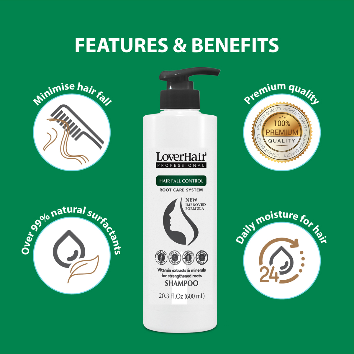• Dầu Gội Ngăn Ngừa Rụng Tóc Lover's Hair Professional Hair Fall Control (600ml) được đặc chế từ nhiều loại thảo dược thiên nhiên có thành phần giàu Vitamin và khoáng chất giúp cải thiện và chăm sóc da đầu, cho mái tóc dày, chắc khỏe và mang hương thơm quyến rũ suốt cả ngày.