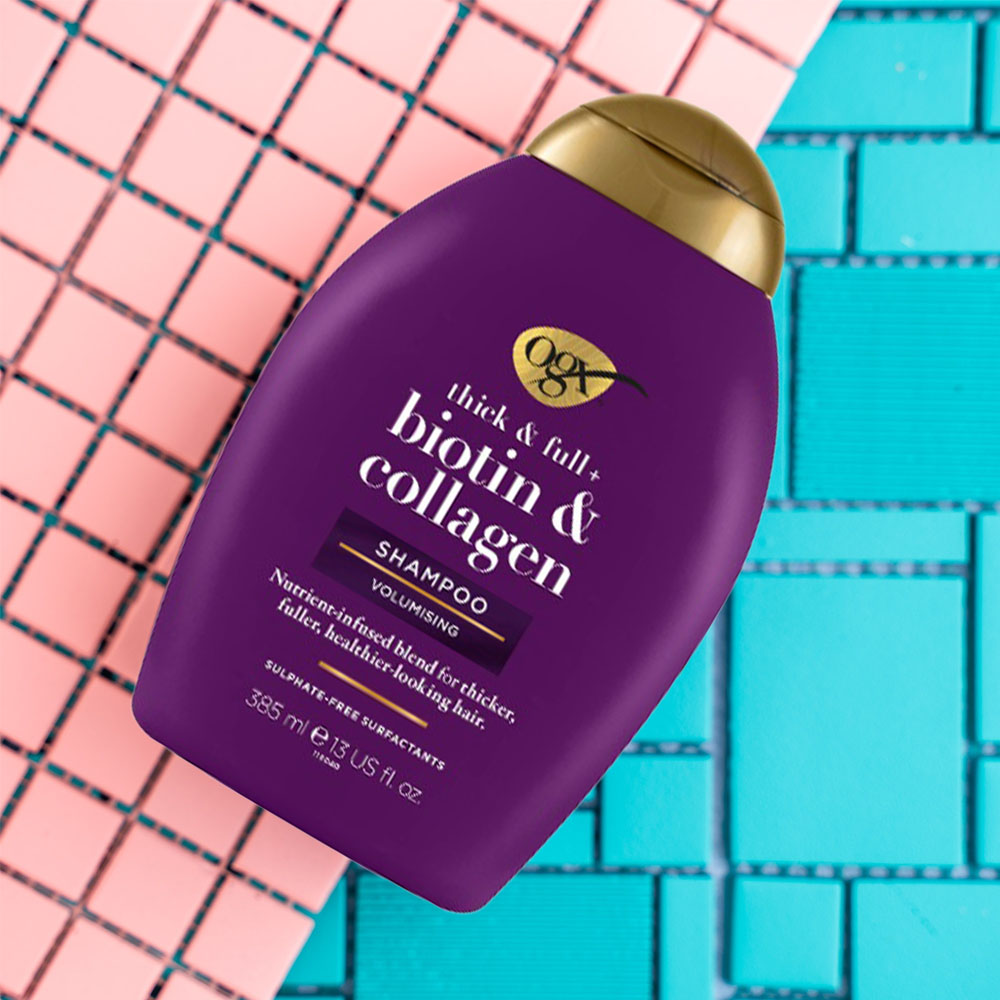 Dầu Gội OGX Thick & Full Bổ Sung Biotin Collagen Cho Tóc 385ml là sự kết hợp độc đáo giữa biotin (vitamin B7), collagen, protein từ lúa mì tạo nên nguồn dưỡng chất đặc biệt thẩm thấu vào từng sợi tóc giúp mái tóc dày hơn, bồng bềnh và luôn chắc khỏe.