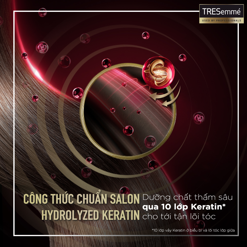 Bộ dầu gội xả TRESemmé Keratin Smooth chứa công thức ưu việt CHUẨN SALON được đặc chế với dưỡng chất Keratin Thủy Phân (Hydrolyzed Keratin) và các Hạt Dưỡng Chất Mềm Mượt Siêu Nhỏ giúp nuôi dưỡng và thấm sâu tới 10 lớp Keratin cho tới tận lõi tóc*, phục hồi hư tổn chuyên sâu cho mái tóc của bạn. Hydrolyzed Keratin (Keratin Thủy Phân) vốn là những hạt dưỡng chất Keratin có kích thước và khối lượng nhỏ cùng với tính ưa nước nên dễ dàng thẩm thấu vào bề mặt tóc hư tổn vốn rất khô xơ do mất ẩm, thay thế lượng protein đã mất, từ đó trả lại cho nàng mái tóc sự mềm mại, bóng mượt như vừa bước ra khỏi salon!
