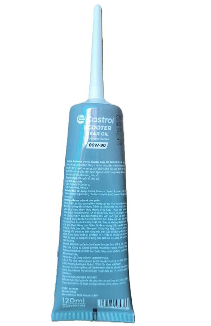 Mua tại TiktokCastrol Scooter Gear oil là dầu hộp số cho xe tay ga (hay còn gọi là dầu Láp) Tiêu chuẩn kỹ thuật: SAE 80W-90, API GL-5 Thể tích thực: 120ml (0,12 lít). Nhiều người sử dụng xe ga thường chỉ nhớ thay dầu động cơ mà quên thay dầu hộp số định kỳ, nếu tình trạng này kéo dài sẽ dẫn đến dầu hộp số cũ trong xe bị hỏng và mất khả năng bôi trơn dẫn đến hỏng bộ bánh răng hộp số, do vậy chúng ta cũng cần phải thay định kỳ dầu hộp số cho xe tay ga, thông thường thì 2 lần thay dầu động cơ thì nên thay dầu hộp số 1 lần.