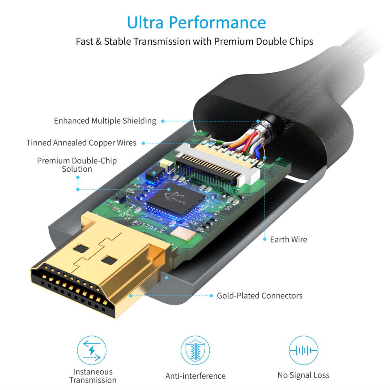 1. 8K resolution support at 60Hz and 4K resolution support at 120Hz for high-definition video and audio. 2. HDR (High Dynamic Range) support for improved color depth, contrast, and brightness. 3. Plug-and-play design, no additional