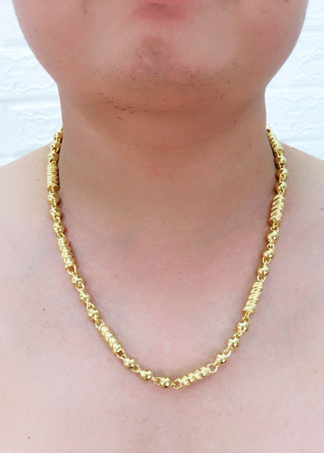 Với thiết kế sang trọng, những mắt xích với đường vân tỉ mỉ, dây chuyền mạ vàng 24k tạo sự mạnh mẽ nhưng không quá cứng nhắc.