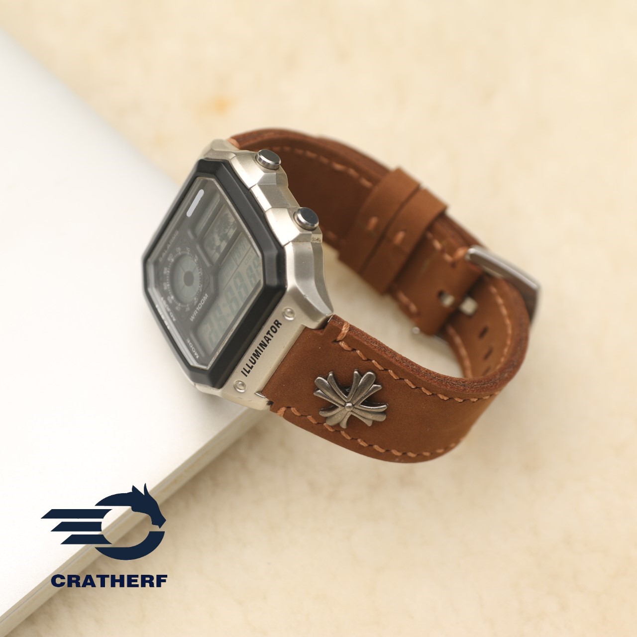 ✨Dây da thay thế dành cho đồng hồ Casio AE1200 da bò sáp nâu Vàng Bò Rivet Handmade