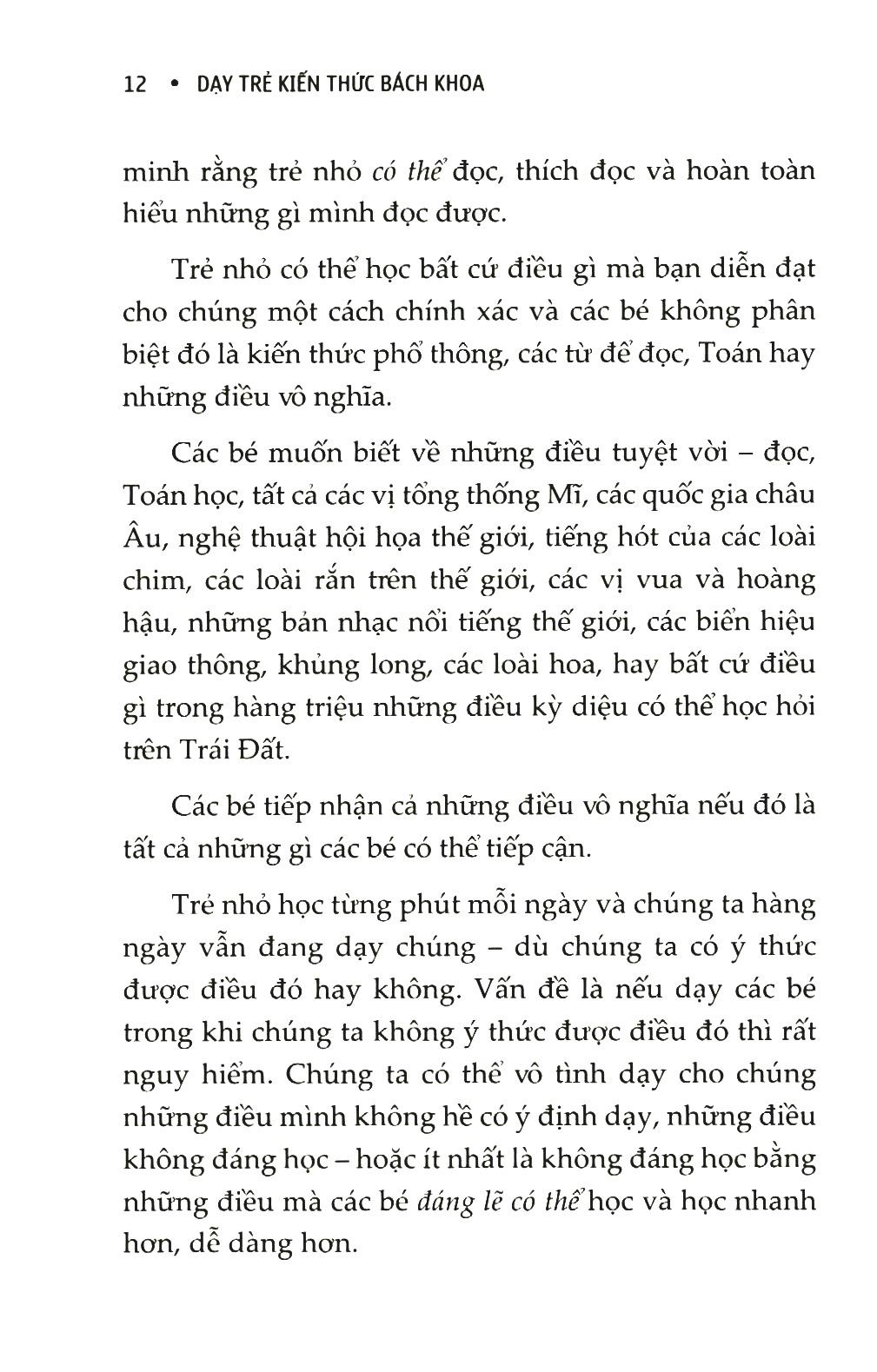 “Dạy trẻ kiến thức bách khoa” cung cấp một chương trình toàn diện để cho bạn thấy việc dạy trẻ cách đọc, làm Toán và mở rộng khả năng học hỏi dễ dàng và thú vị đến mức nào. Cuốn sách hướng dẫn bạn cách bắt đầu và mở rộng chương trình đầy ý nghĩa này. Cách tạo ra và sắp xếp các tài liệu cần thiết và cách để phát triển toàn diện hơn khả năng học hỏi của trẻ.