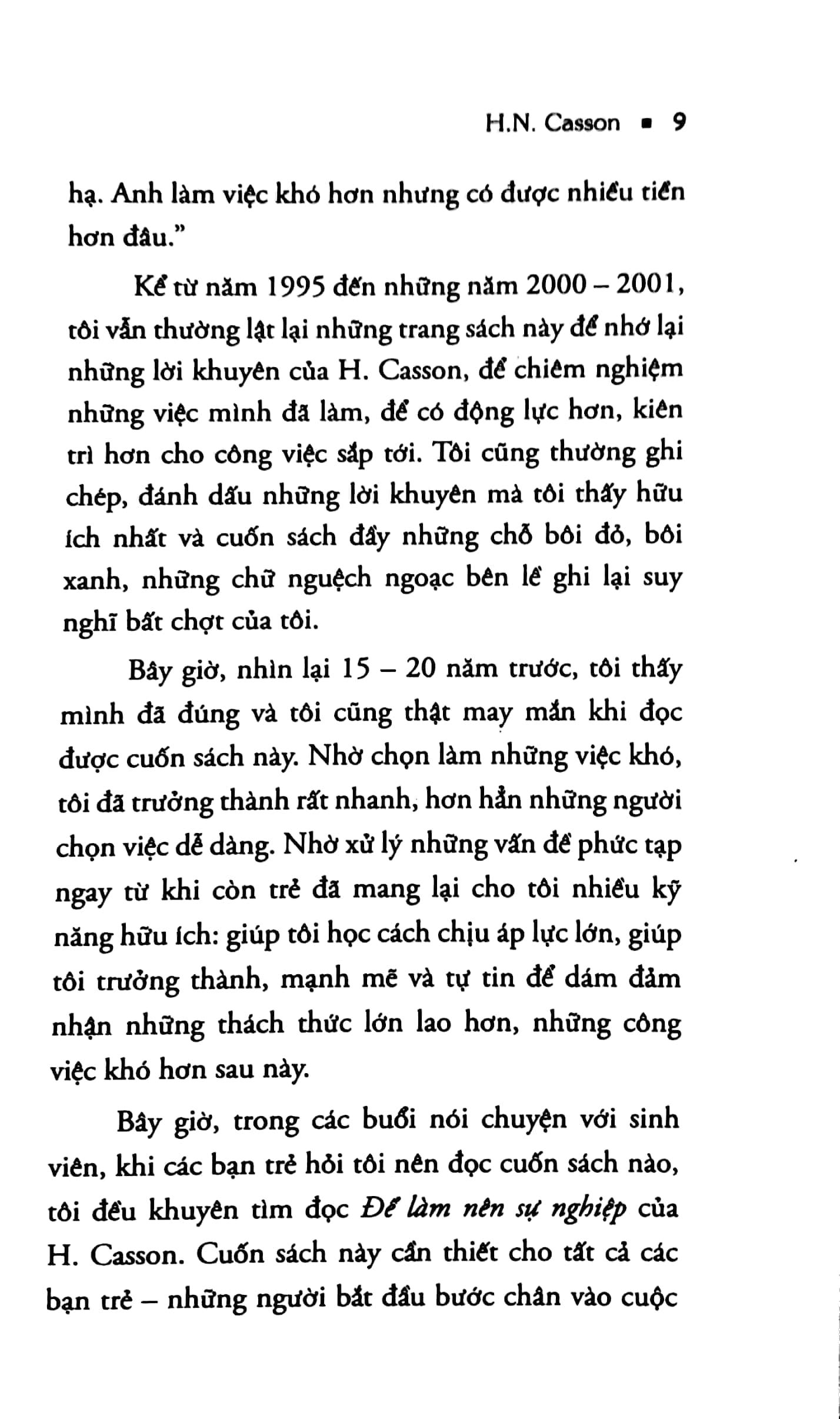 Bây giờ, nhìn lại 15 - 20 năm trước, tôi thấy m.ình đã đúng và tôi cũng thật may mắn khi đọc cuốn sách này. Nhờ chọn làm những việc khó, tôi đã trưởng thành rất nhanh, thành công hơn hẳn những người chọn công việc dễ dàng. Việc xử lý những vấn đề phức tạp ngay từ khi còn trẻ đã mang lại cho tôi nhiều kỹ năng hữu ích: giúp tôi học cách chịu áp lực lớn, giúp tôi trưởng thành, mạnh mẽ và tự tin để dám làm những công việc khó hơn sau này. Kể từ đó và cho đến thời điểm năm 2000 - 2001, tôi vẫn thường lật lại những trang sách này để khắc sâu lời khuyên của H. Casson, để chiêm nghiệm những việc m.ình đã làm, để có động lực tốt hơn, kiên trì hơn cho công việc sắp tới. Tôi cũng thường ghi chép, đánh dấu những lời khuyên mà tôi thấy hữu ích nhất. Sau này, khi các bạn trẻ hỏi tôi nên đọc cuốn sách nào, tôi đều khuyên tìm đọc Làm nên của H. Casson. Tuy nhiên, do cuốn sách xuất bản quá lâu và không được tái bản nên ngày nay các bạn trẻ khó có cơ hội tiếp cận. Hơn nữa, bản dịch của Phạm Cao Tùng cũng chưa được chau chuốt, nhiều lỗ vì thế chúng tôi đã tiến hành hiệu đính, biên tập cho phù hợp với văn phong hiện đại. Cuốn sách Làm nên cần thiết cho tất cả các bạn trẻ - những người bắt đầu bước chân vào cuộc sống, những người đang hoang mang tìm cho m.ình một lối đi. Tất cả mọi người sẽ tìm thấy những lời khuyên hữu ích cho m.ình ở đây. Hãy học theo, hãy rèn luyện, hãy kiên trì, chắc chắn bạn sẽ thành công. Đây là cuốn đầu tiên dạy tôi làm thế nào để thành công trong cuộc sống, tôi đã làm theo và thành công. Vì thế, tôi tin rằng các bạn trẻ cũng sẽ thành công nếu làm như vậy." - Nguyễn Cảnh Bình, C.E.O Alpha Books