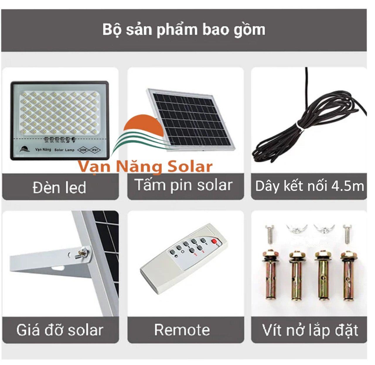 ️ sản phẩm bao gồm : tấm pin rời kèm dây 4,5m + đèn + remote + ốc vít +giá đỡ + phiếu bảo hành và giấy HDSD