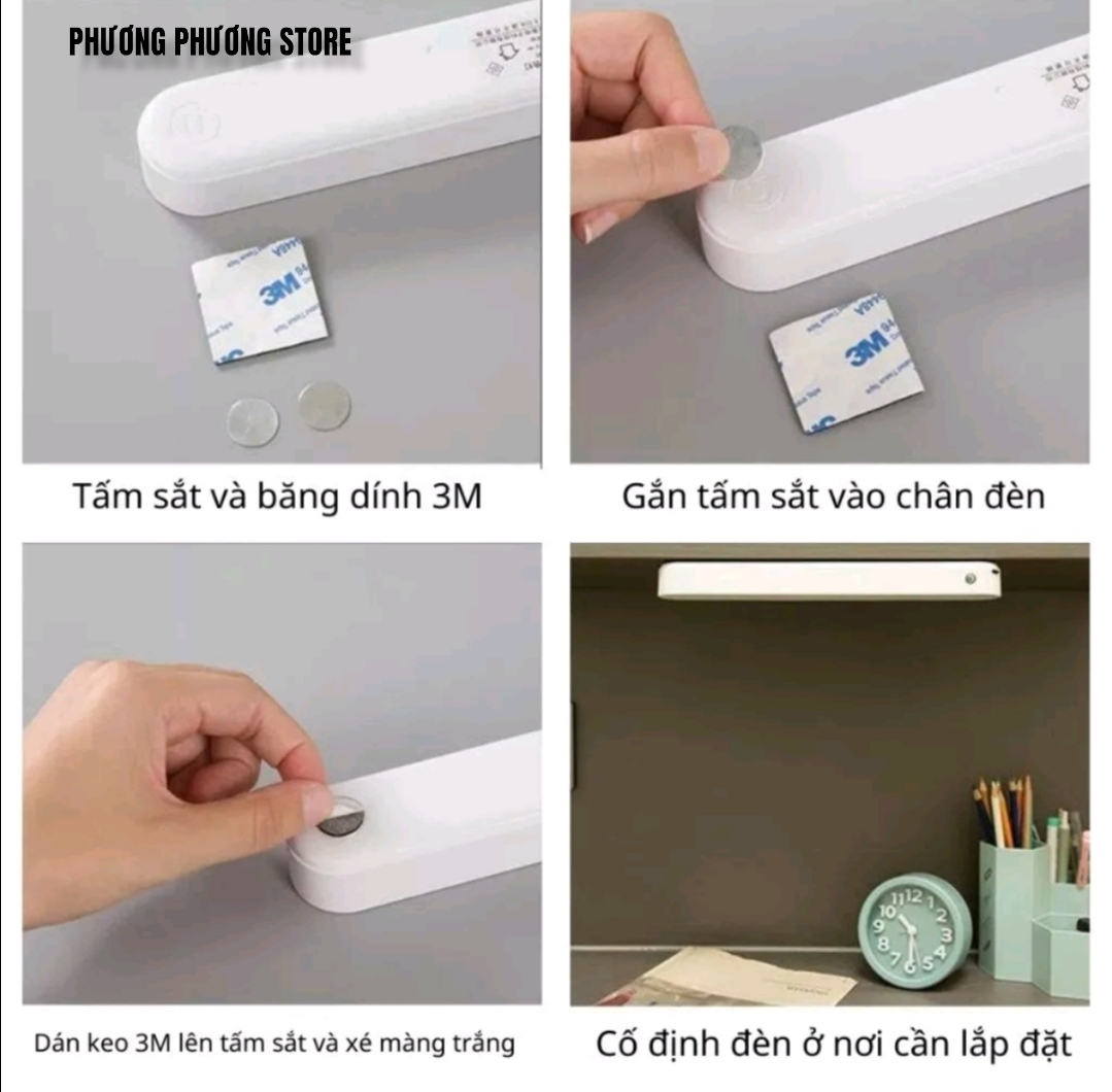 - Đèn sử dụng miếng dán 3M để cố định đế đèn vào tường, tủ, bàn học, mọi vị trí dễ dàng.