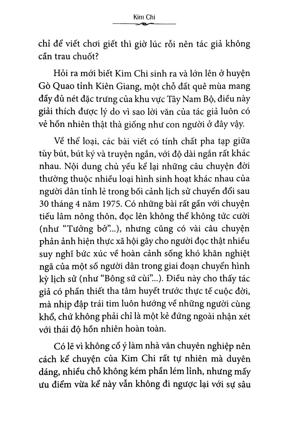 Kim Chi không phải là nhà văn chuyên nghiệp… Nhưng khi được dịp xem qua bản thảo tản văn này, tôi và một vài người bạn khác không khỏi có chút kinh ngạc khi thấy trong văn của tác giả có những nét rất đặc trưng của người Việt miền Tây Nam Bộ, thể hiện qua cách diễn đạt và sử dụng từ ngữ, phảng phất phong cách, giọng điệu kiểu Đồng quê của Phi Vân ngày trước, với rất nhiều từ ngữ đặc sệt miền Nam. Còn cách kể chuyện thì trơn tuột lưu loát như văn nói, nghĩ sao viết vậy, không kiểu cọ màu mè.