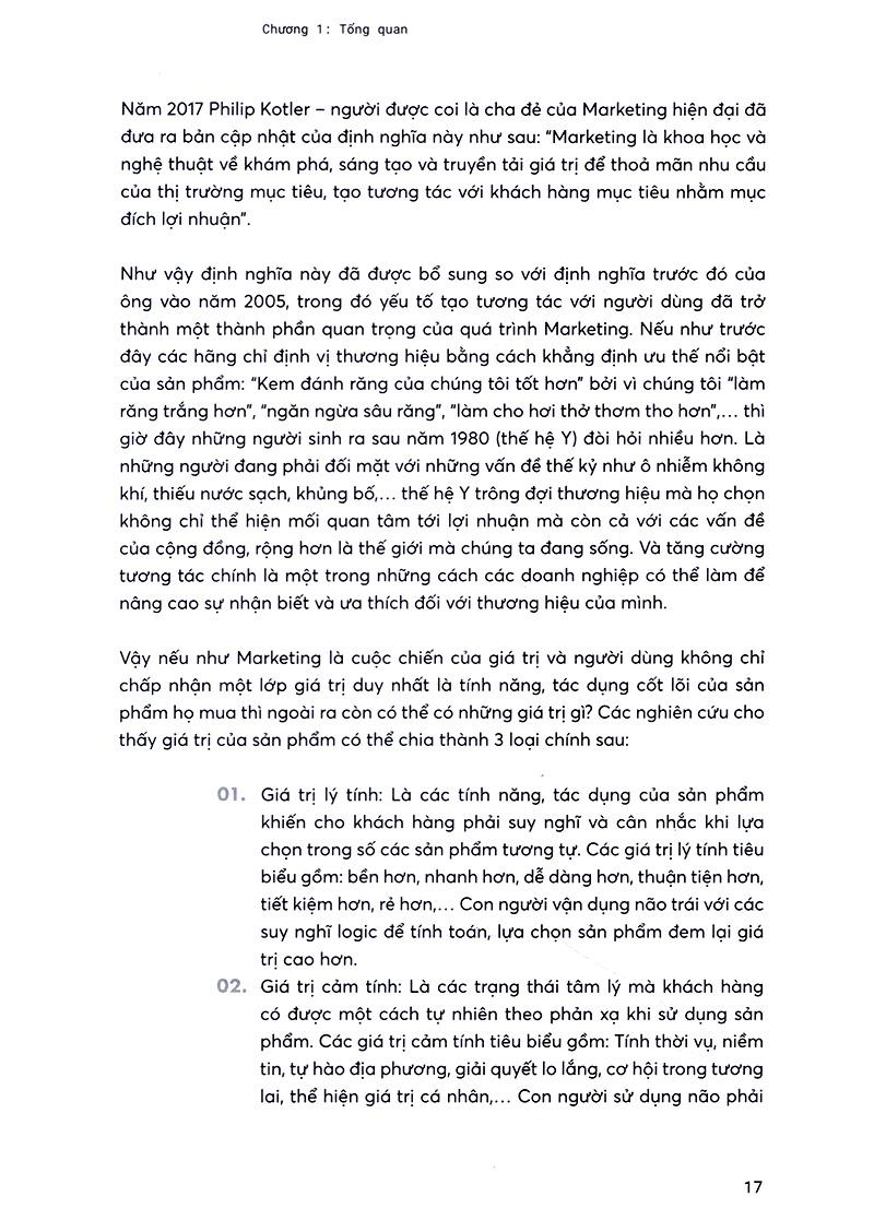 ➤ Cuốn sách có độ dài dài 5 chương và 1 phần bonus, khai thác thực tiễn thị trường Việt Nam kết hợp với các kiến thức chuẩn về Marketing của các học giả nổi tiếng như Philip Kotler, Al Ries, Jack Trout, vừa mang lại những góc nhìn toàn cảnh, vừa đi sâu vào ứng dụng thực tế qua các case study trong nước gần gũi, đa dạng: