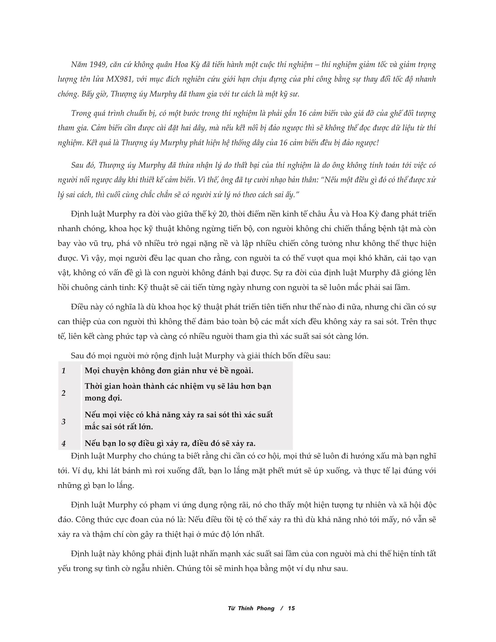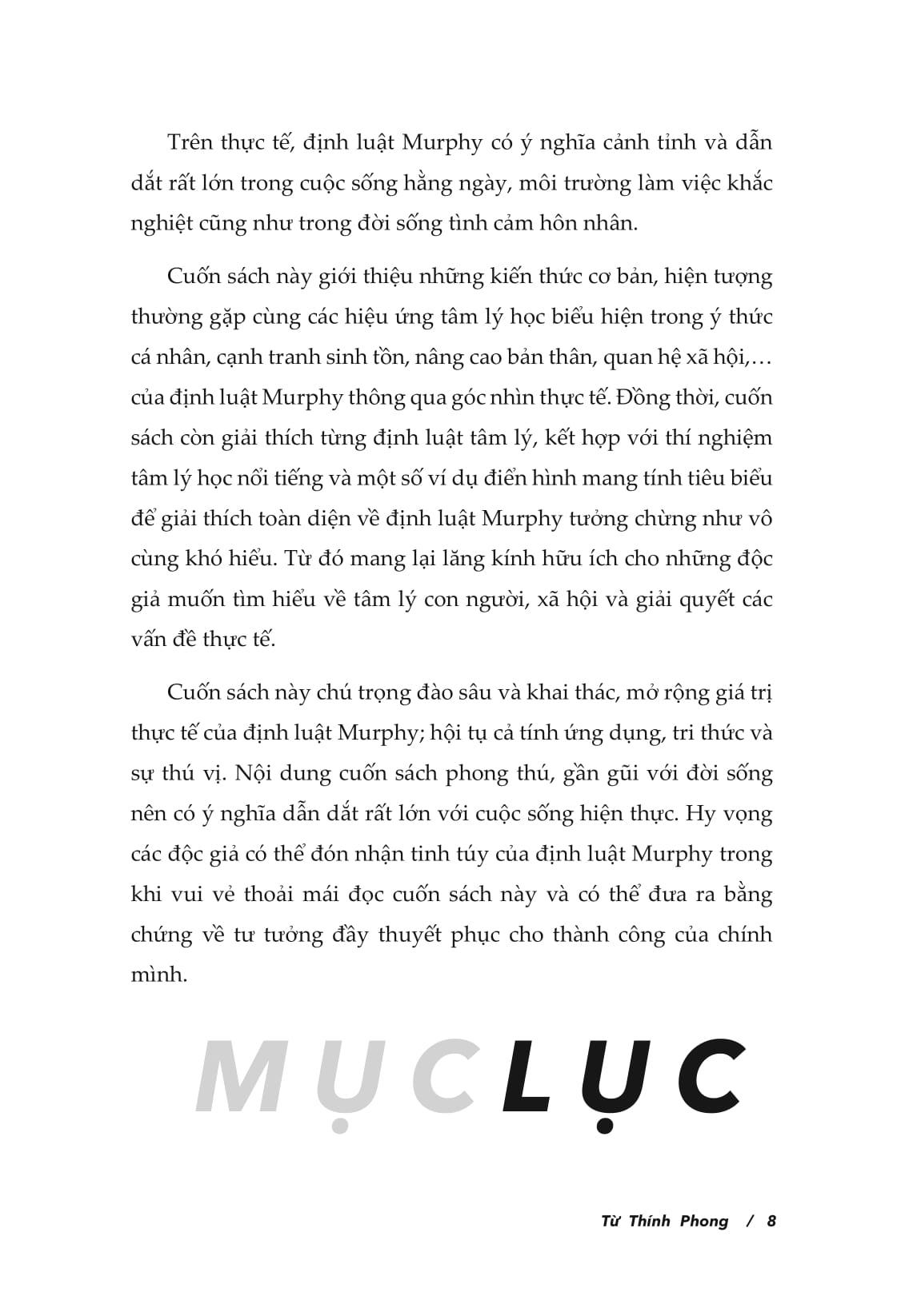 Tuy nhiên, định luật Murphy mang tính cảnh tỉnh và dẫn dắt rất lớn trong cuộc sống hằng ngày. Cuốn sách này giới thiệu đến với bạn đọc về kiến thức cơ bản, hiện tượng thường gặp cùng với các hiệu ứng tâm lý học biểu hiện trong ý thức cá nhân, tính cạnh tranh, quan hệ xã hội,… của định luật Murphy thông qua góc nhìn thực tiễn. Từ đó giúp bạn đọc hiểu được bản chất con người, bản chất xã hội rồi ứng dụng nó vào giải quyết các vấn đề gặp phải trong cuộc sống.
