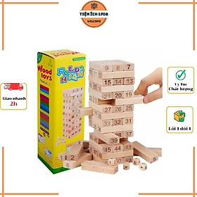 • Mô tả : 48 thanh được khắc số từ 1 đến 48; 4 hạt xí ngầu được khắc số từ 1 đến 4.    Nào chúng ta cùng rút các que gỗ nhỏ ra mà không làm đổ chồng tháp cao này. Giúp trẻ rèn luyện tính cẩn thận và khéo léo. Với trò chơi này, các bé có thể chơi cùng nhau, tinh thần chiến thắng đồng đội sẽ được các bé thể hiện và phát huy. Trò chơi này cũng đang được rất nhiều bạn trẻ ưa chuộng, như một cách thư giãn với bạn bè sau những giờ học tập căng thẳng.   Không chỉ dành cho trẻ em, trò chơi rút gỗ còn giúp giới văn phòng xả stress cực kì hiệu quả sau những giờ làm việc căng thẳng. Bạn có thể giữ món đồ chơi này rất lâu vì nó khá bền.   Bộ trò chơi có kích thước nhỏ gọn nên rất dễ dàng trong việc di chuyển. Bạn có thể mang đi bất cứ đâu bạn muốn để có thể tranh tài cùng bạn bè. Bộ đồ chơi rút gỗ sẽ giúp trẻ rèn luyện tính cẩn thận và khéo léo. Với trò chơi này, các bé có thể chơi cùng nhau, tinh thần chiến thắng đồng đội sẽ được các bé thể hiện và phát huy. Toàn bộ đều làm bằng chất liệu gỗ siêu nhẹ, các mặt được đánh láng mịn, giảm thiểu ma sát nhưng để rút được thanh gỗ ra ngoài mà không làm sập tháp gỗ cũng là cả một vấn đề. Bạn cần phải vận dụng hết sự khéo léo, nhẹ nhàng của mì      Bộ sản phẩm gồm 48 thanh gỗ hình chữ nhật in số từ 1 đến 48 ở hai đầu và 4 hột xí ngầu 6 mặt có in các chữ số từ 1 đến 4. Có thể chơi hai người hoặc nhiều người, dùng xúc xắc để chọn lượt chơi. Người chơi lần lượt đổ xúc xắc và quy định cách rút, sau đó sẽ rút thanh gỗ rồi xếp chồng lên trên. Các cách rút phổ biến là rút số chẵn - lẻ tùy theo nước của xúc xắc là chẵn hay lẻ.