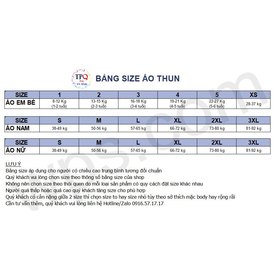 • - Áo Size nam nữ như nhau: s <48kg, M < 57kg, L < 67kg, XL < 77kg, xxl < 86kg .( em bé trên 13 kg vui lòng ghi chú cân nặng và chiều cao)