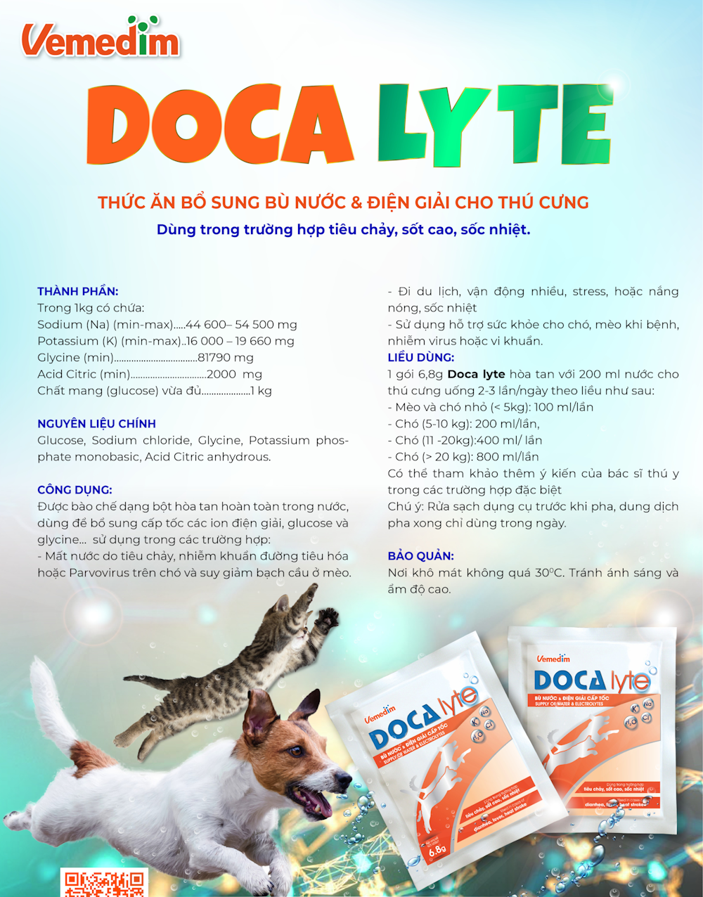 - Sản phẩm của công ty Vemedim. CÁCH DÙNG: Pha 1 gói Docalyte với 200ml nước, cho thú cưng uống từ 2-3 lần/ ngày theo liều như sau: